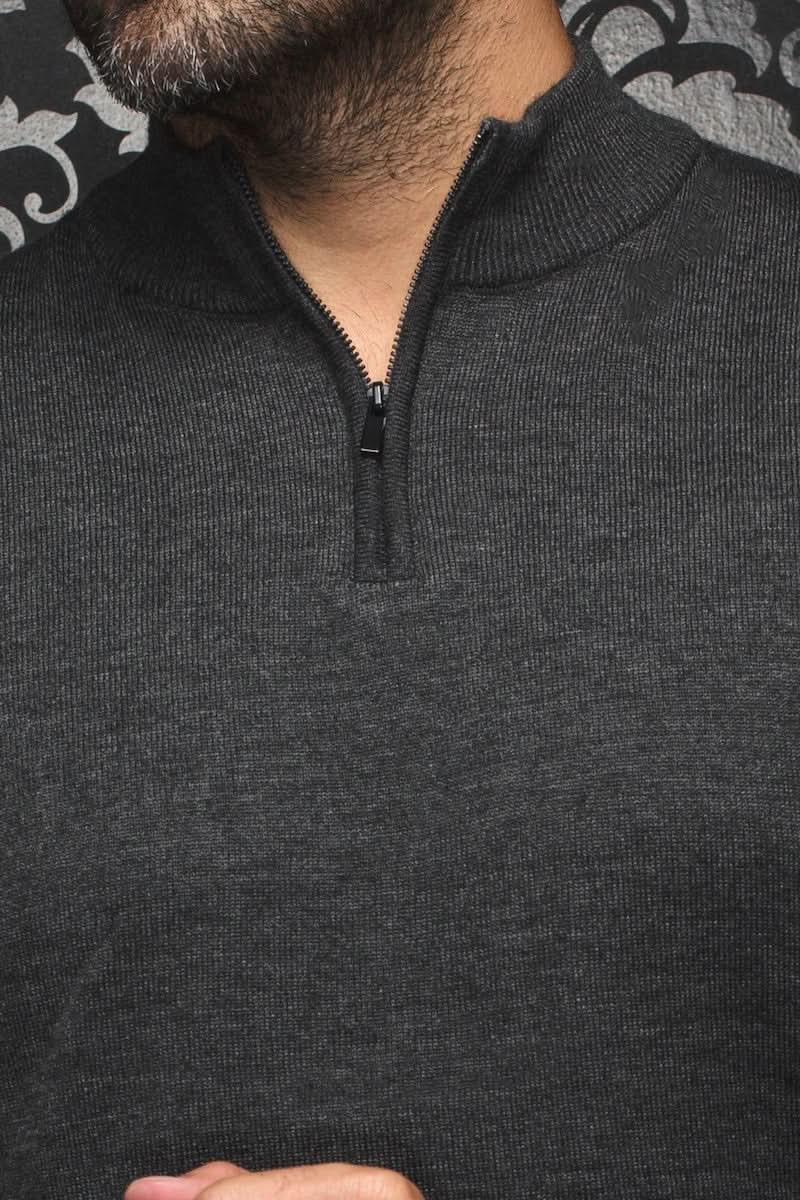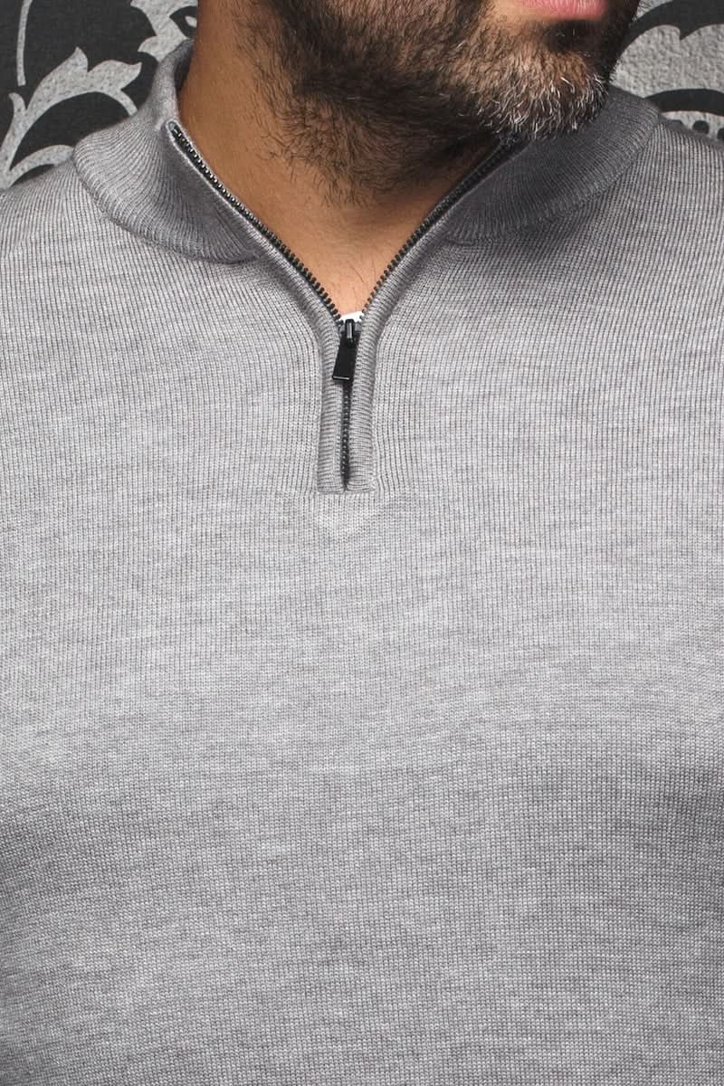 Homme portant un chandail gris en laine mérinos avec col montant et fermeture éclair, sur fond noir élégant.