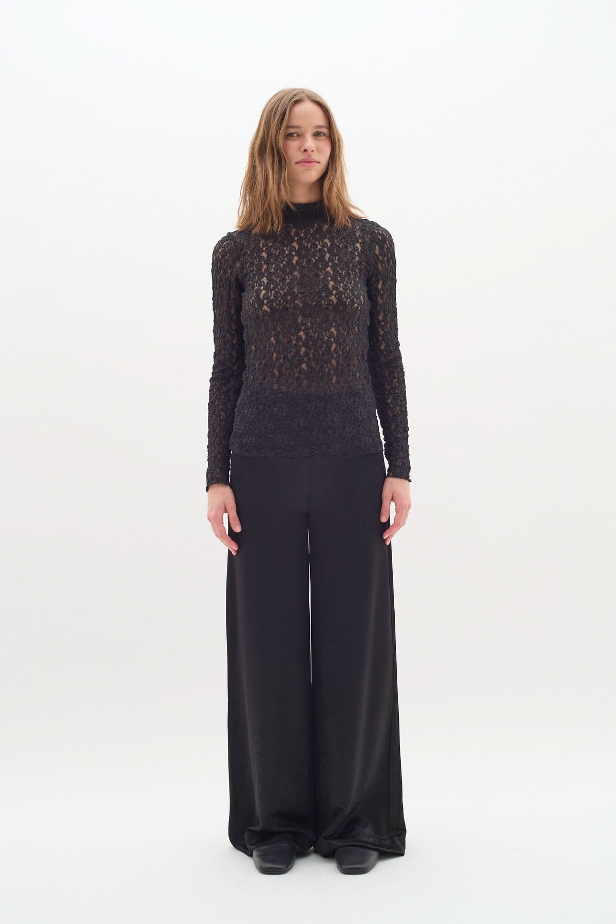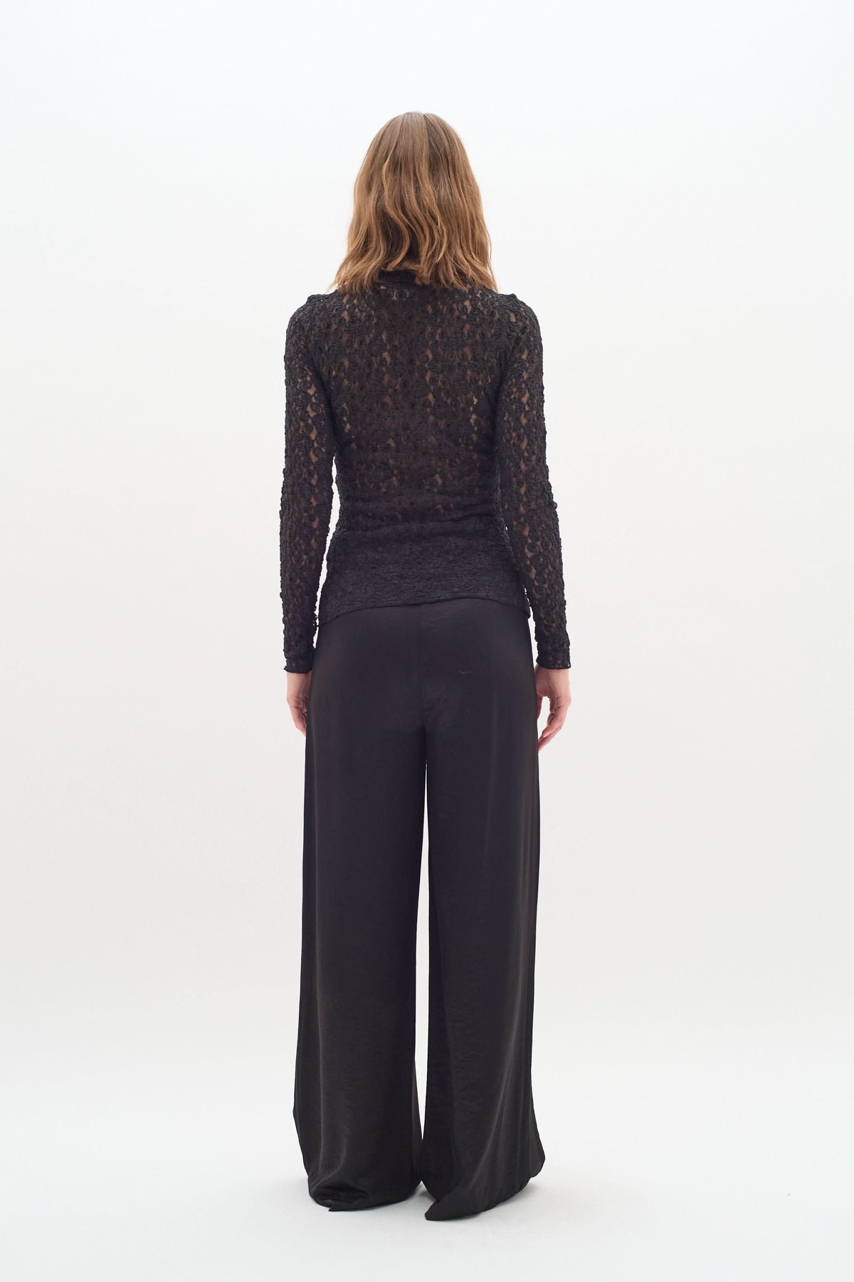 Description : Pantalon droit en tissu satiné noir, conçu pour une allure chic et minimaliste. Ce modèle se distingue par sa texture subtilement brillante qui ajoute une touche de sophistication et de modernité à votre look.
