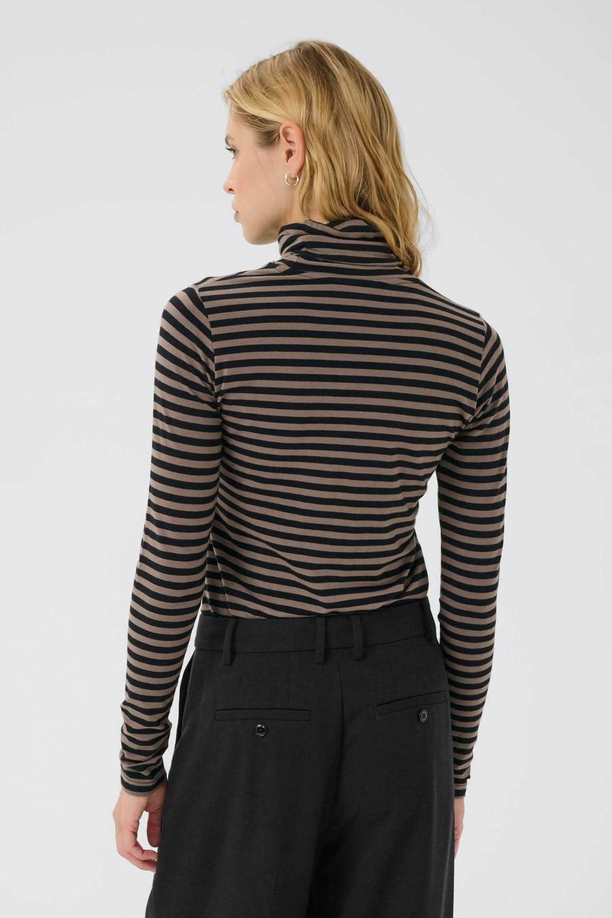 Femme portant un col roulé Efinas rayé noir et marron, manches longues, coupe ajustée, élégance polyvalente et confortable.
