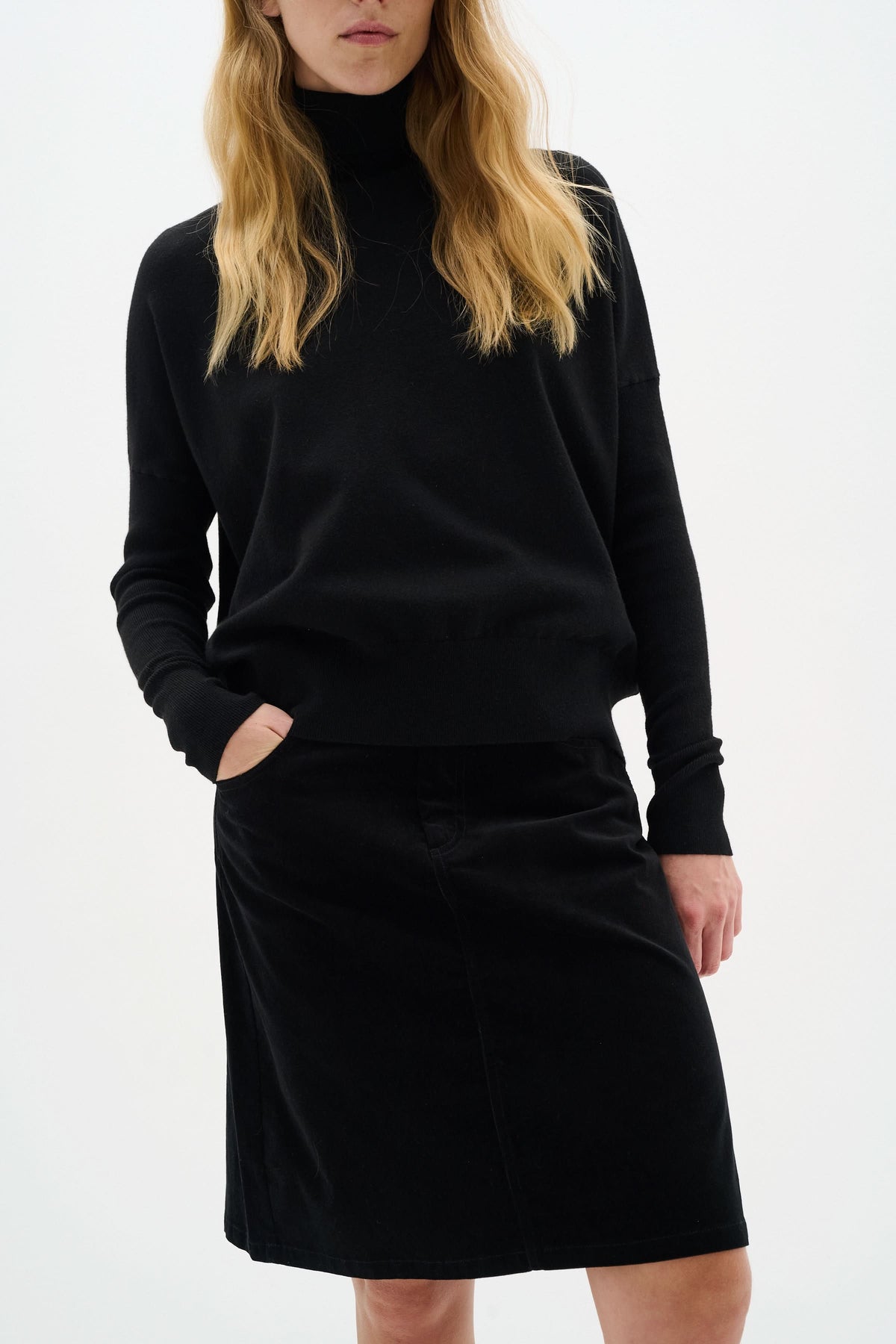 Femme en pull noir col montant et jupe noire, tenue chic et moderne pour les soirées.