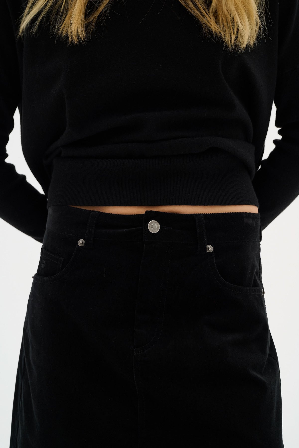 Jupe Rylie en velours noir avec poches avant et arrière, coupe slim, moderne et élégante.
