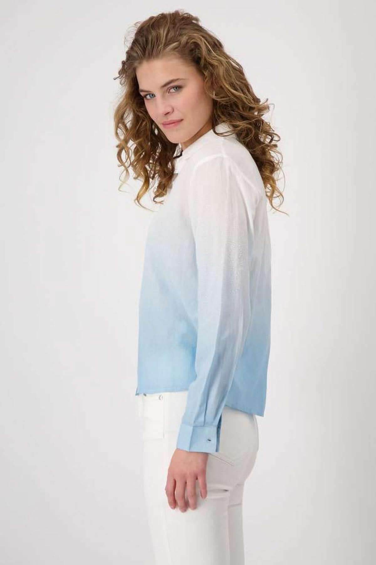 Chemise fluide à effet batik dégradé bleu, avec col chemise et manches longues.