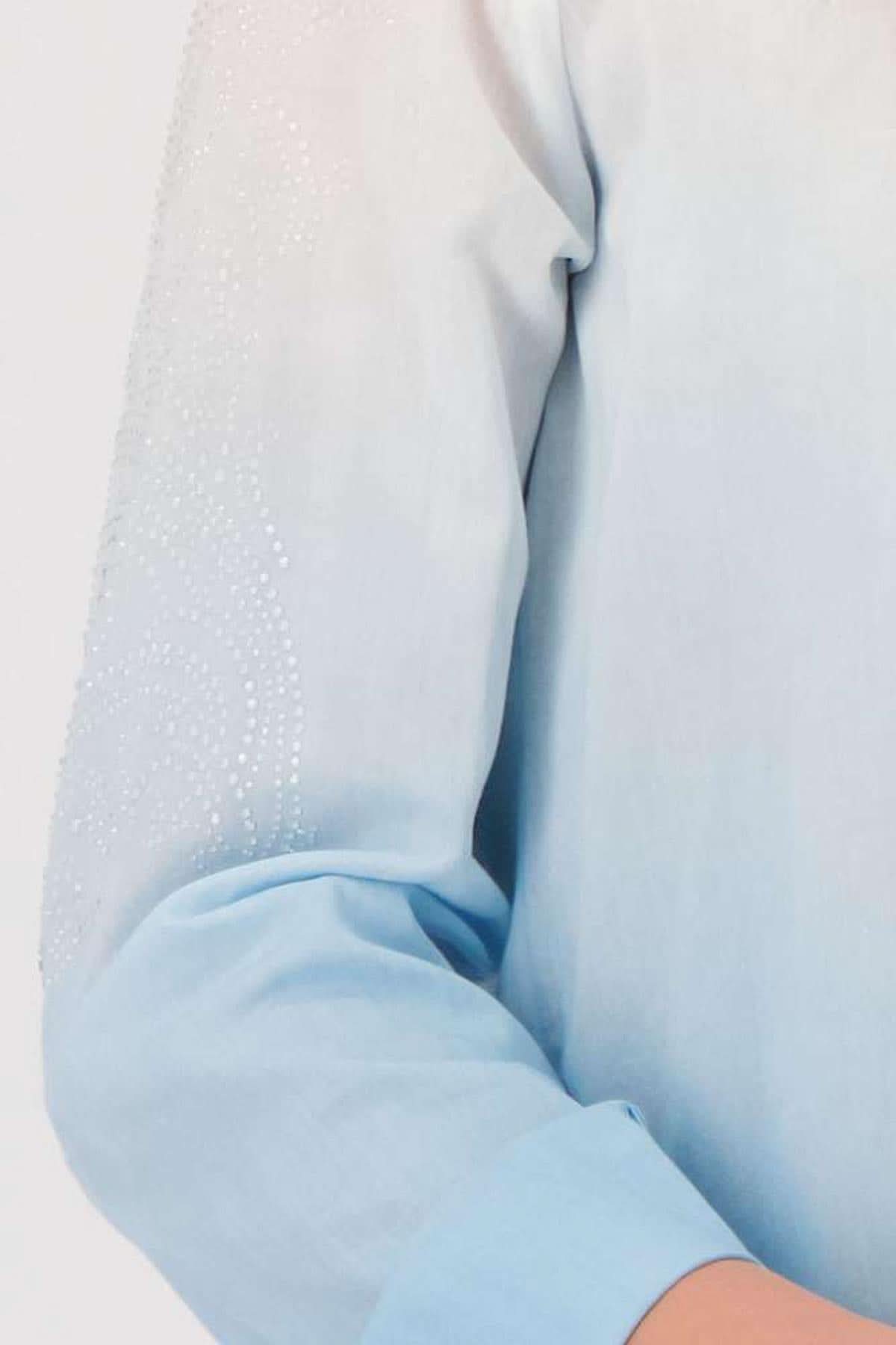 Chemise fluide à effet batik bleu dégradé avec strass transparents et col structuré, look moderne et élégant.