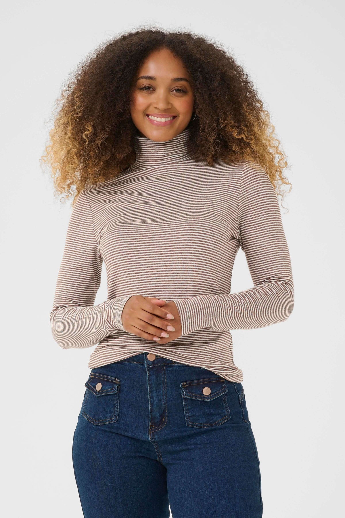 Description : Ce chandail à col roulé rayé est un essentiel polyvalent qui allie confort et style. Sa coupe ajustée épouse délicatement la silhouette tout en offrant une sensation douce et extensible. Parfait seul ou sous un veston, il apporte une touche moderne et décontractée à vos tenues du quotidien.