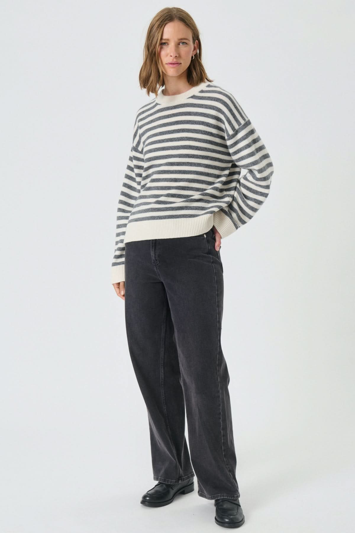 Description : Chandail à manches longues orné de rayures horizontales, confectionné dans une maille douce au tomber souple. Sa coupe légèrement ample et son col rond côtelé lui donnent une allure décontractée et contemporaine. Idéal pour une tenue de week-end avec un jeans ou un pantalon habillé pour un style marin revisité.