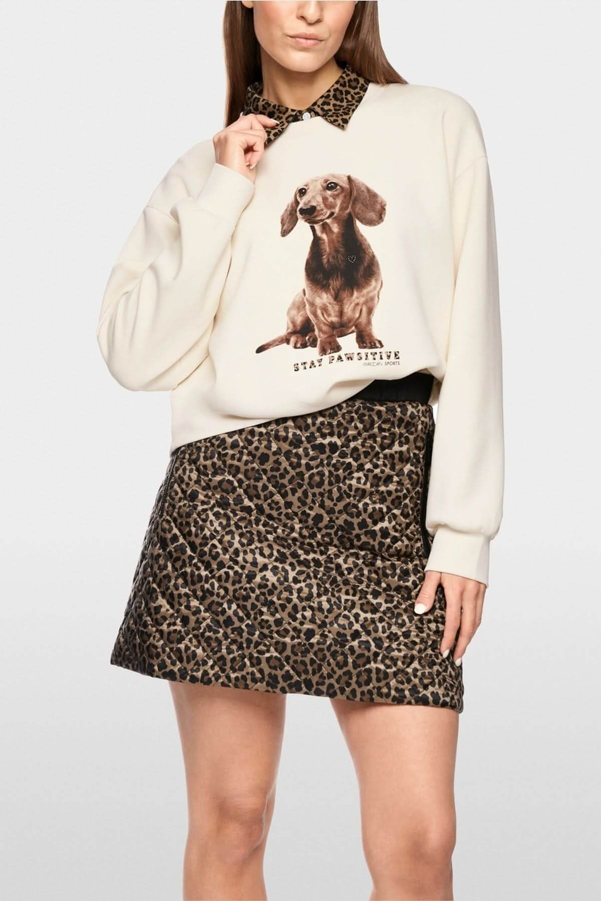 Description: Coton ouaté à col rond orné d’un imprimé chien accompagné du message « Stay Pawsitive ». Sa coupe décontractée et sa matière douce en font une pièce confortable et tendance, parfaite pour un style casual affirmé. À porter avec une jupe, un jean ou un pantalon pour un look original et moderne.