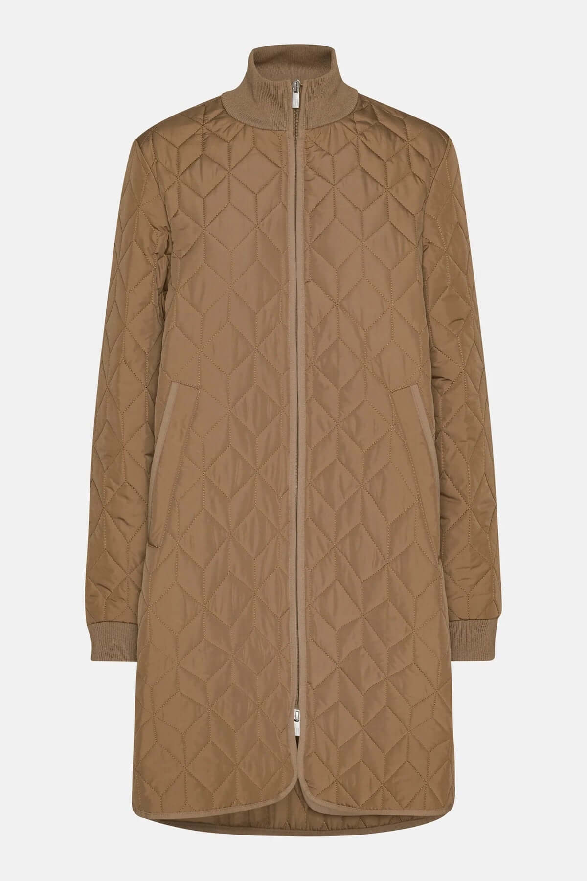 Manteau matelassé long à col montant, léger et chaud, avec motifs géométriques. Style moderne pour journées fraîches.
