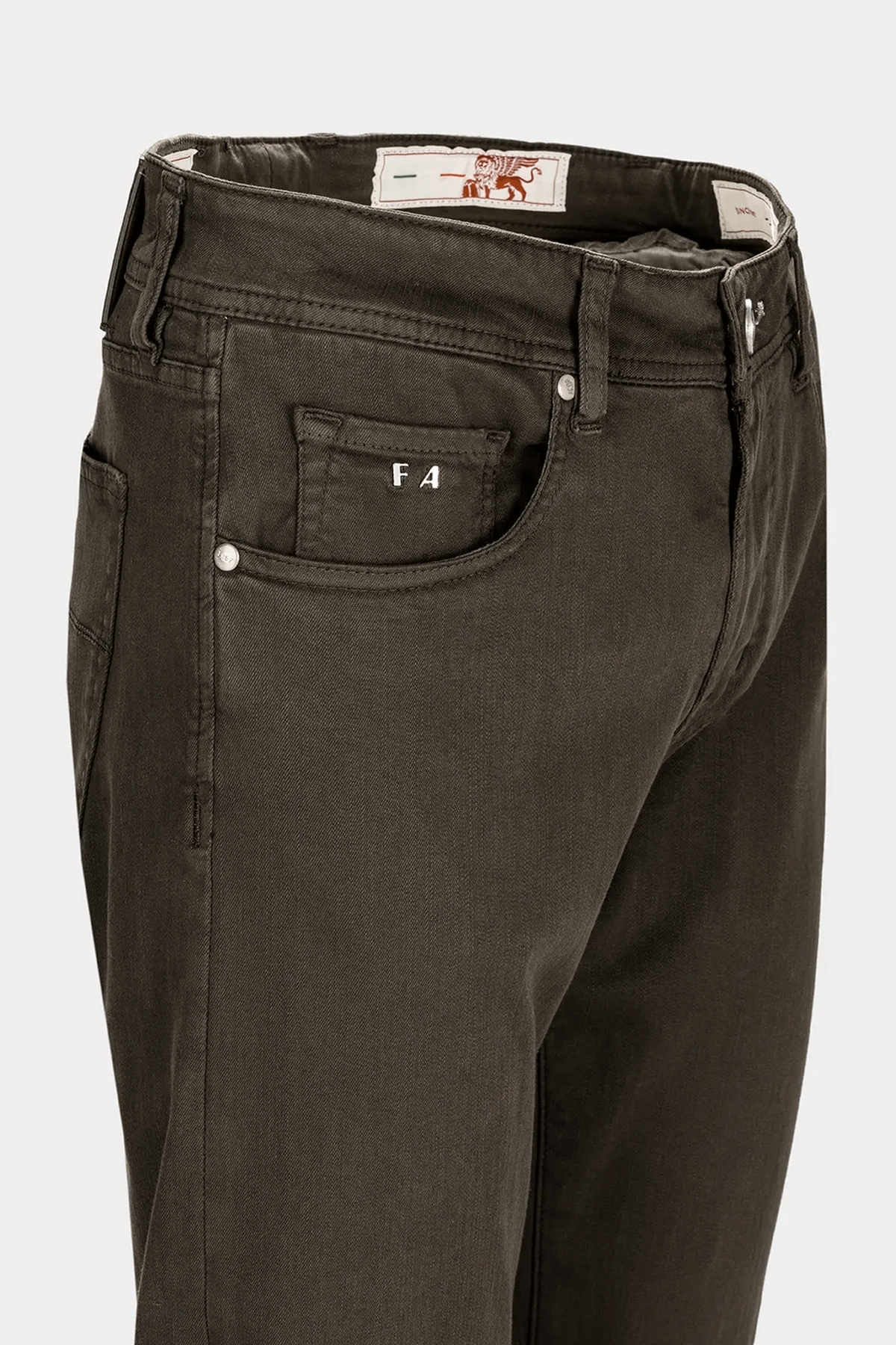 Pantalon de coton 5 poches pour homme avec coupe regular slim, élégance italienne et confort, vue détaillée du tissu et des poches.
