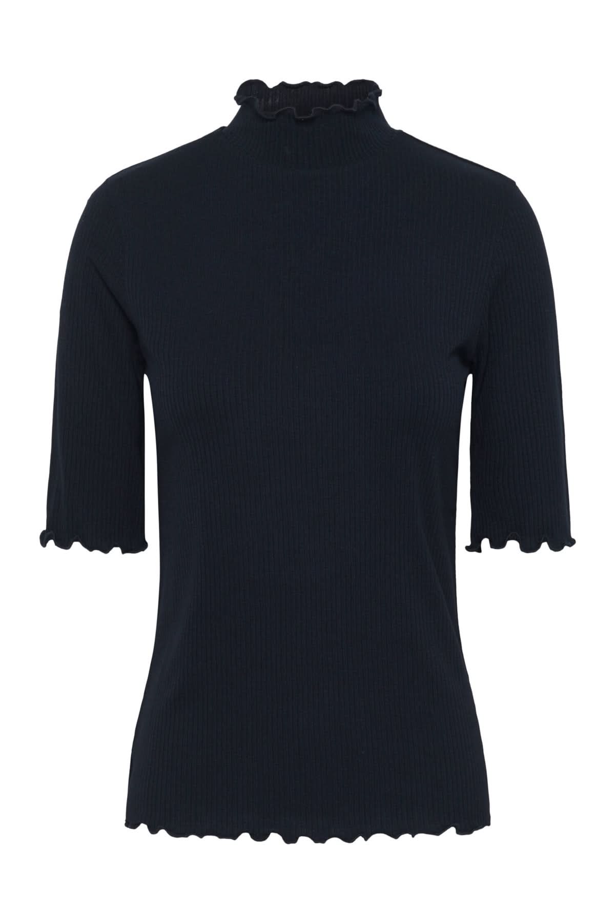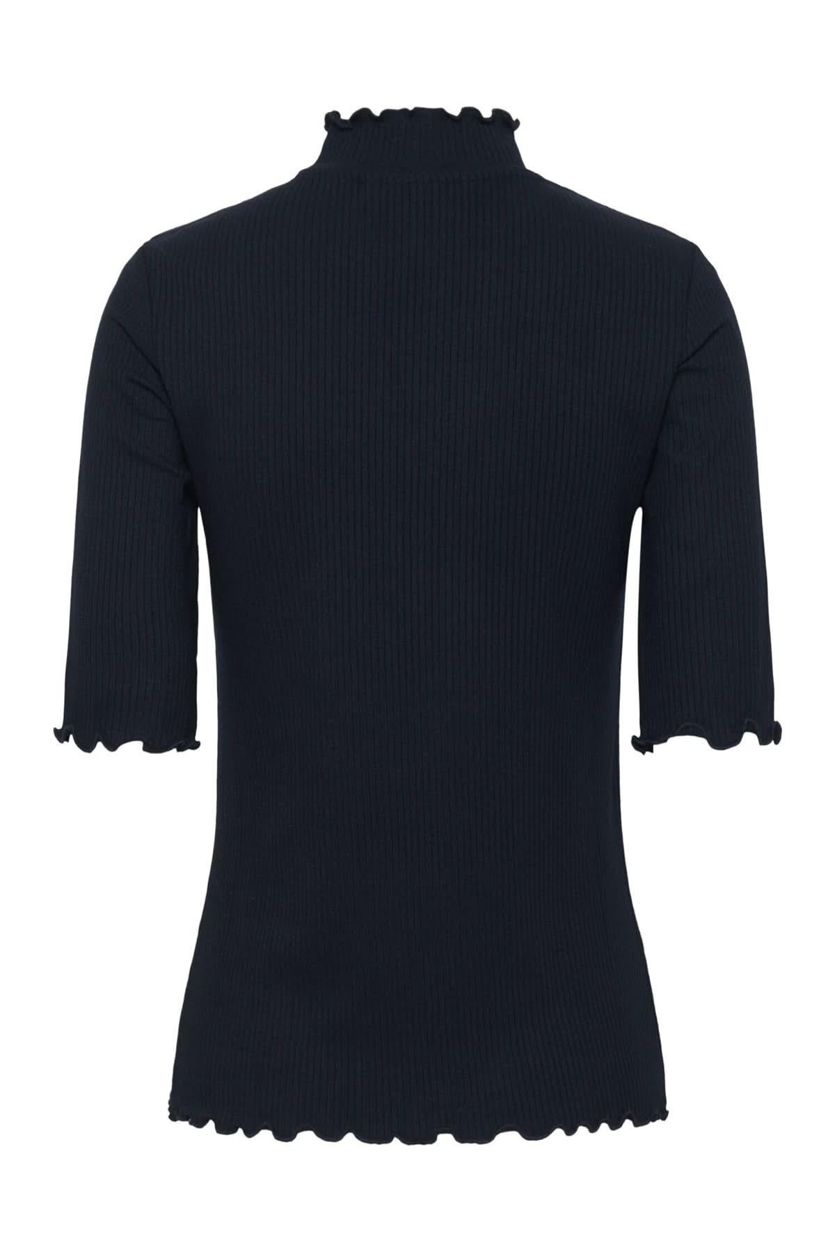 T-shirt Ribba à col montant, maille côtelée noire avec finitions festonnées, manches mi-longues. Coupe ajustée et féminine.