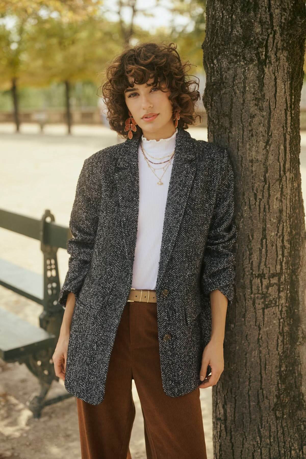Person wearing a tweed blazer with a white t-shirt and brown trousers standing by a tree in a park setting.