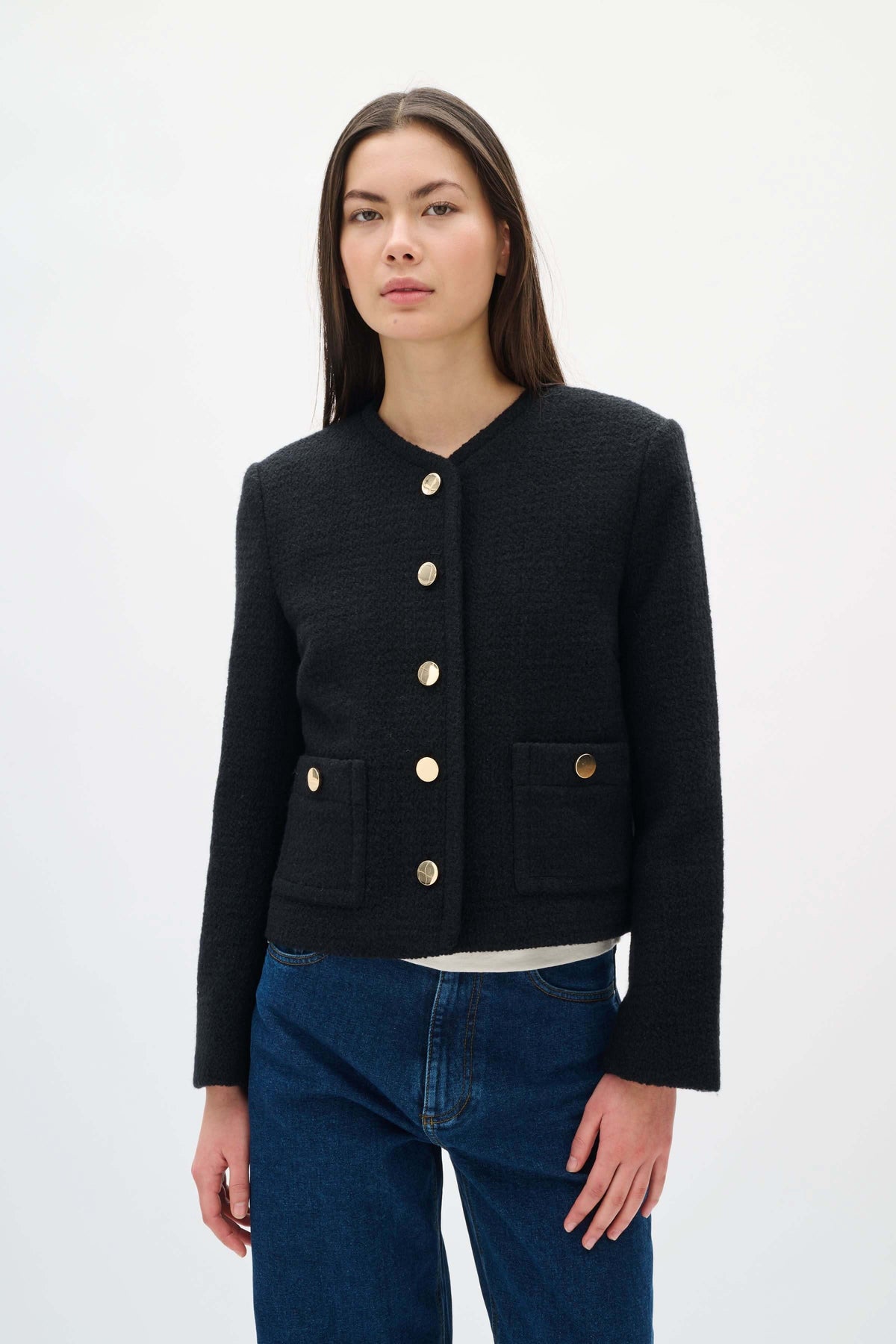 Description : Veste courte à la coupe droite, confectionnée dans un tissu texturé au toucher structuré. Les boutons dorés et les poches plaquées à l’avant ajoutent une touche élégante et intemporelle. Conseil style : portez-la avec un jean droit ou une jupe midi pour un look chic et moderne au quotidien