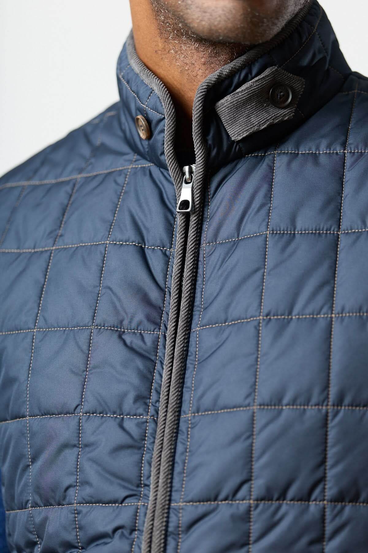 Veste sans manches matelassée avec détails en velours côtelé, vue de près sur le col et le tissu, élégante et pratique.