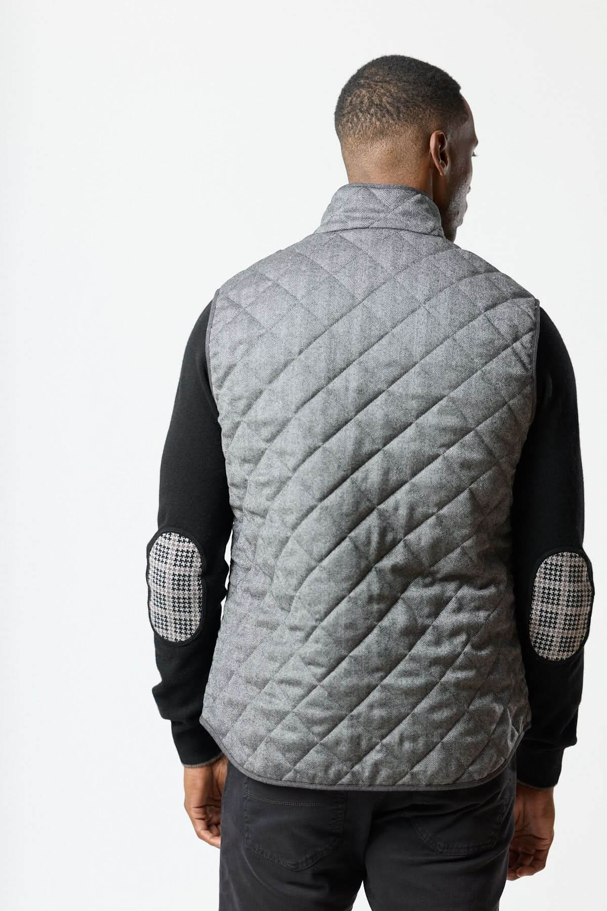 Homme portant une veste sans manches matelassée en laine à motif chevrons vue de dos.
