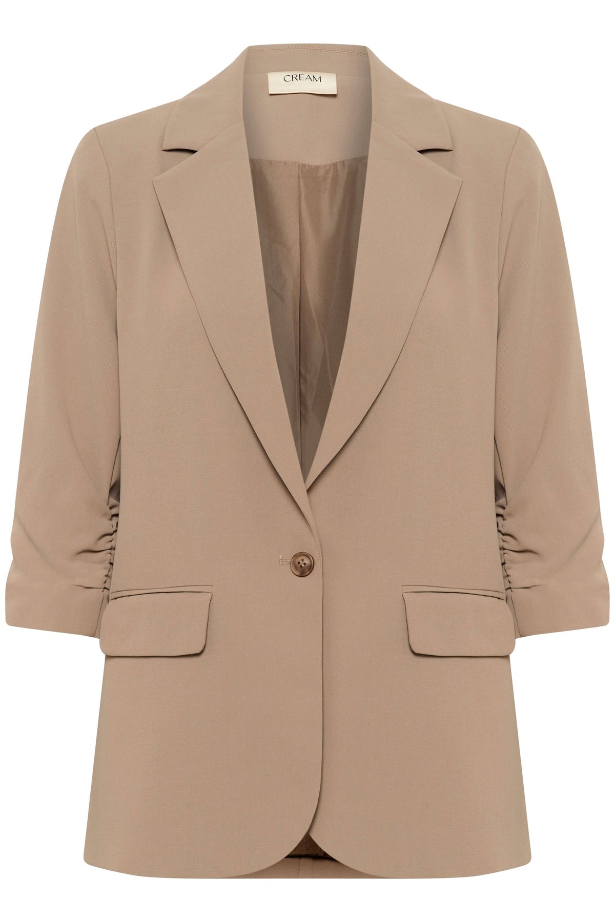 Veston beige à coupe décontractée avec fermeture à un bouton et manches froncées, idéal pour bureau et sorties.