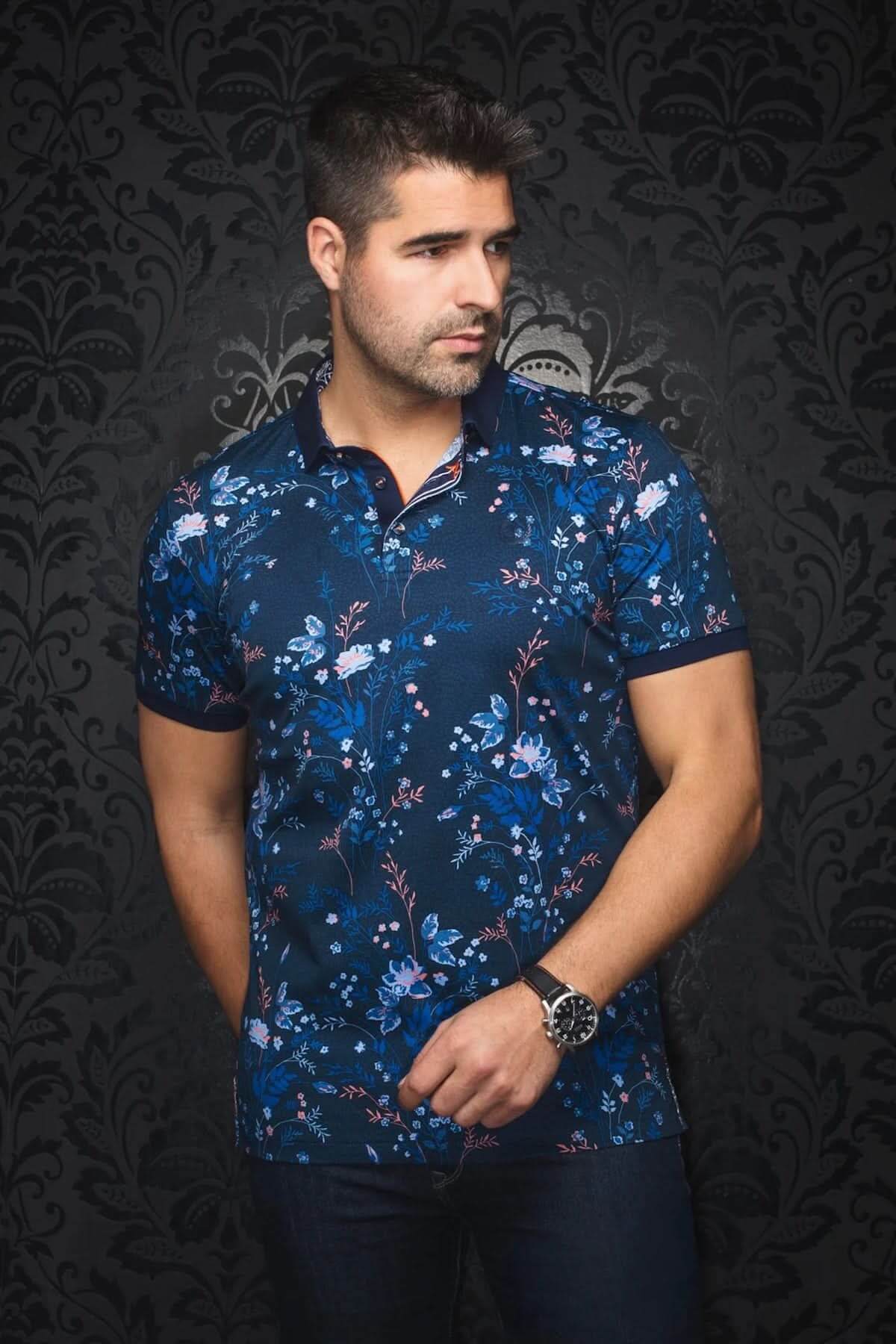 Polo fleuri pour homme sur fond marine, style audacieux et moderne, parfait pour le week-end.