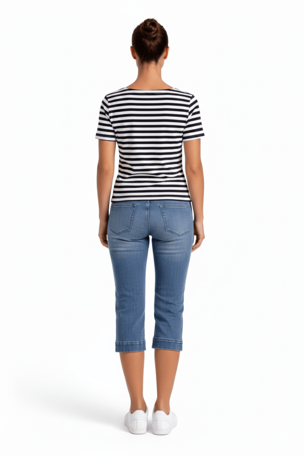 Description : Ce jeans capri offre une silhouette ajustée et moderne, idéale pour la saison estivale. Sa coupe flatteuse épouse les formes tout en assurant un confort optimal au quotidien. Facile à agencer, il s’intègre parfaitement à une garde-robe décontractée et polyvalente.