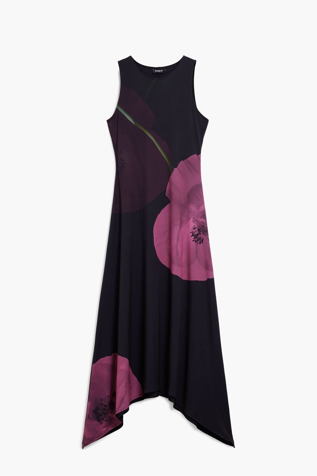 Robe asymétrique coquelicot sans manches, imprimé floral artistique, silhouette fluide et ourlet moderne, tenue élégante et décontractée.