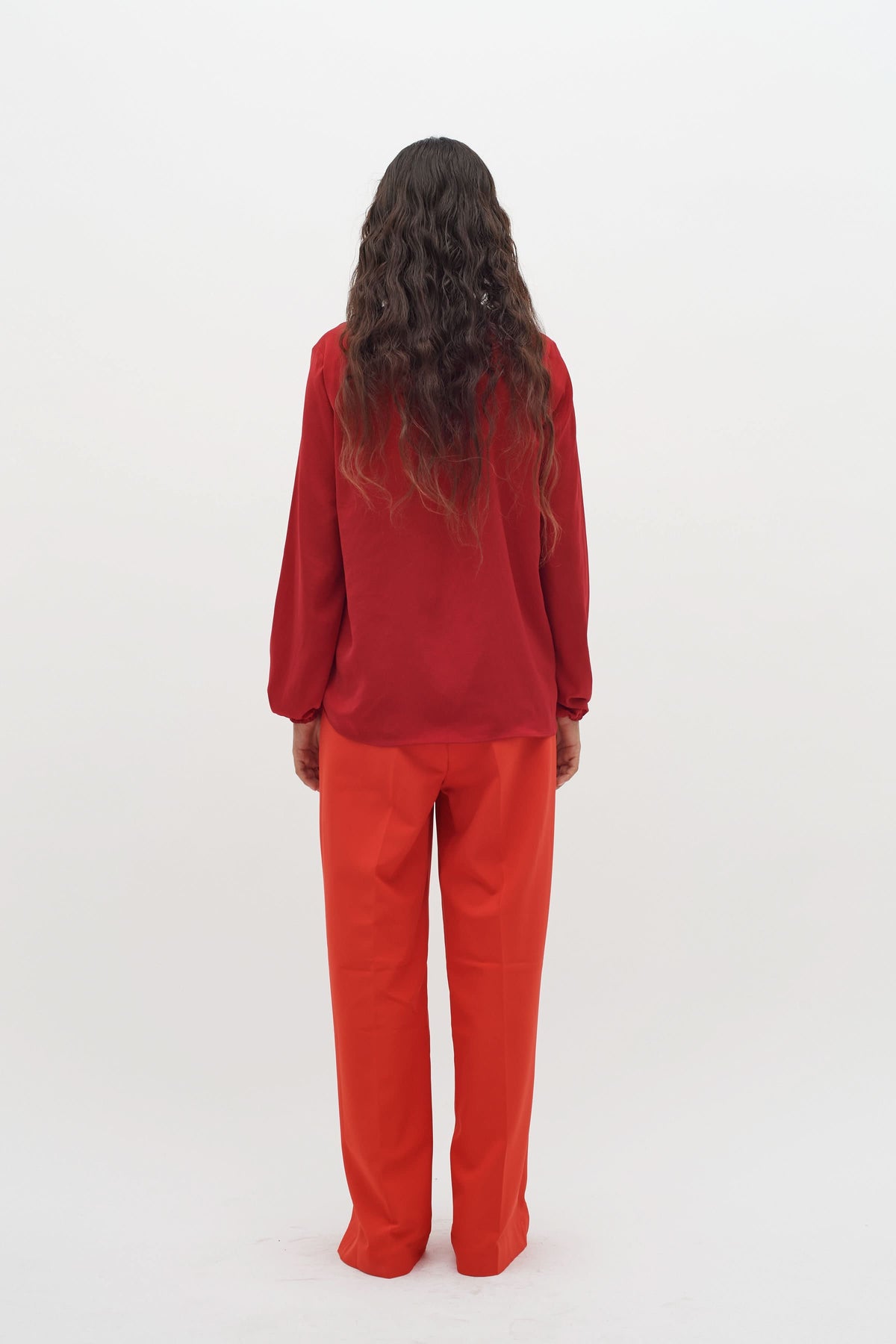 Femme vue de dos portant une blouse rouge col en V avec manches longues et pantalon beige ample.