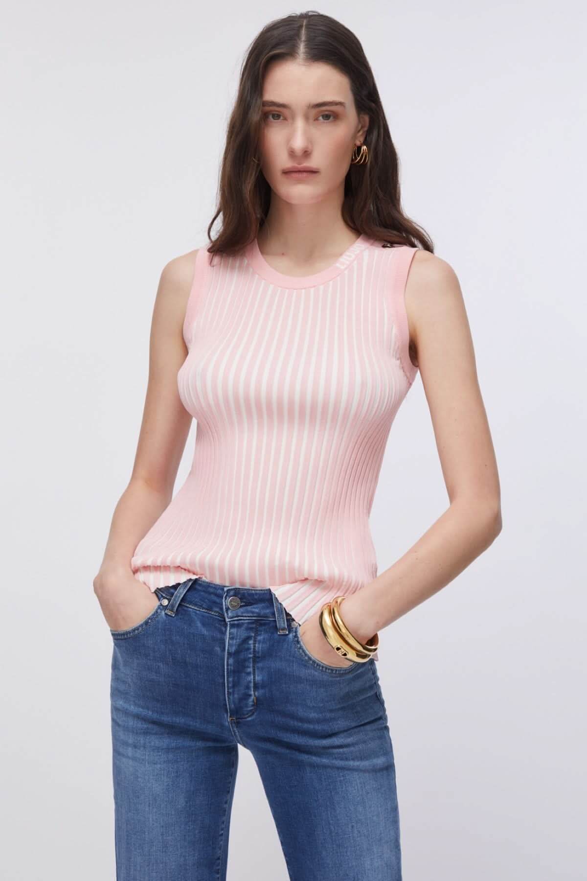 Cette camisole en maille côtelée offre une silhouette ajustée et moderne. Son tricot extensible épouse confortablement la silhouette tout en assurant une grande liberté de mouvement. Facile à superposer ou à porter seule, elle s’intègre parfaitement dans une garde-robe polyvalente.