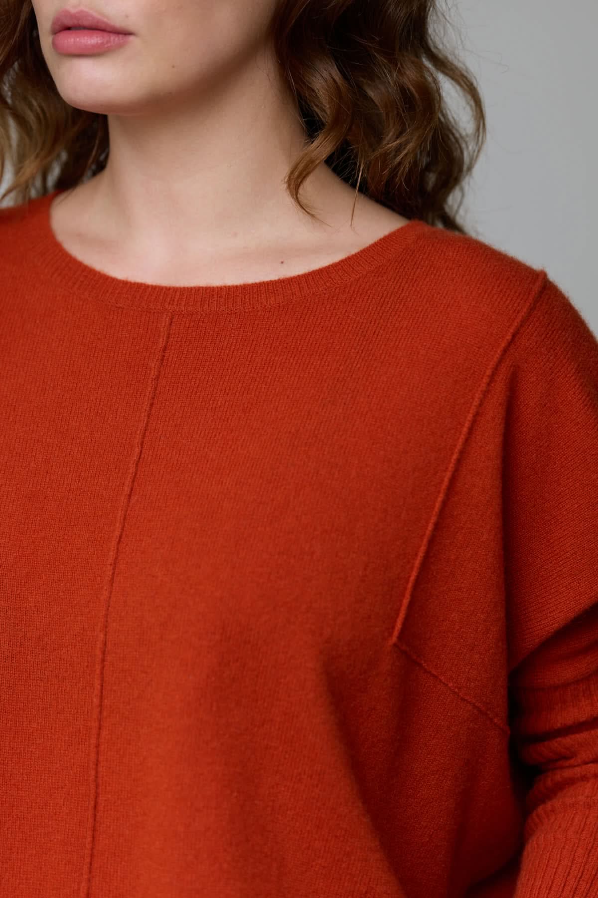Femme portant un chandail ample à col rond, couleur orange, avec coutures apparentes et manches tombantes, style moderne et décontracté.