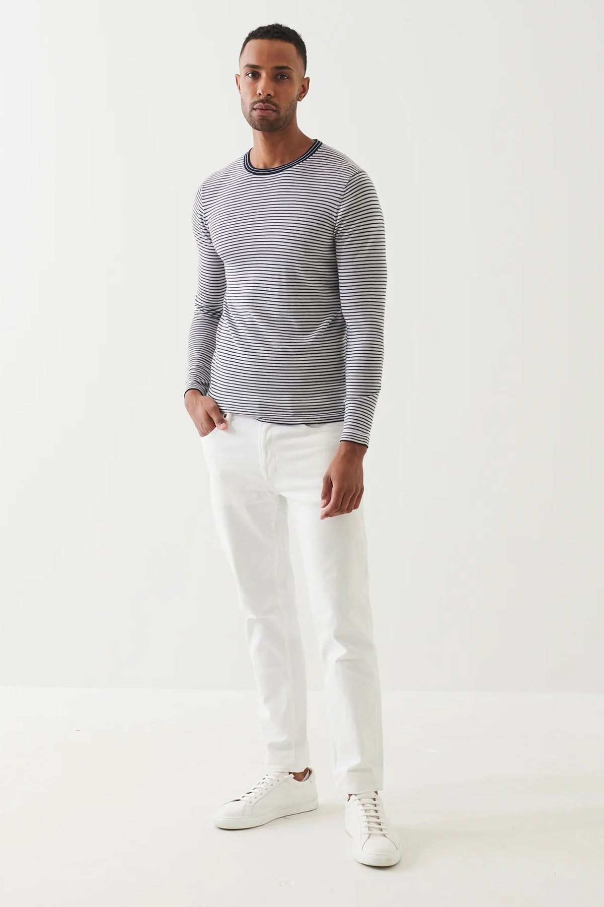 Description : Chandail à rayures intemporel, revisité dans une coupe ajustée et un tricot souple. Confortable et polyvalent, il s’adapte aussi bien à un look décontracté qu’à une superposition élégante. Un essentiel à la fois moderne et classique.
