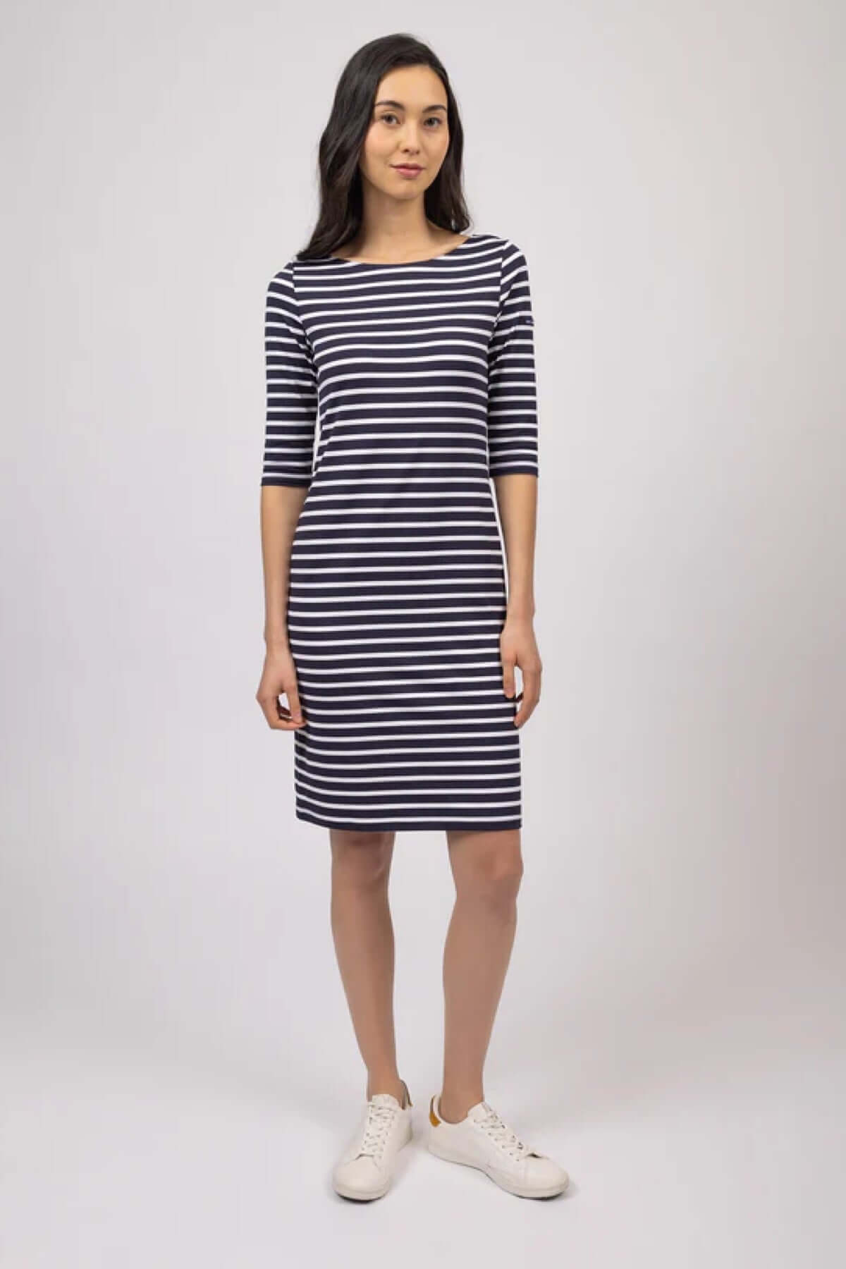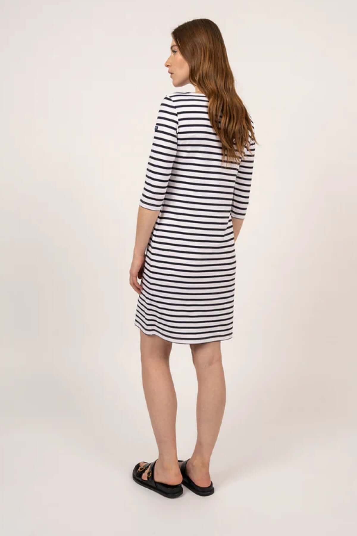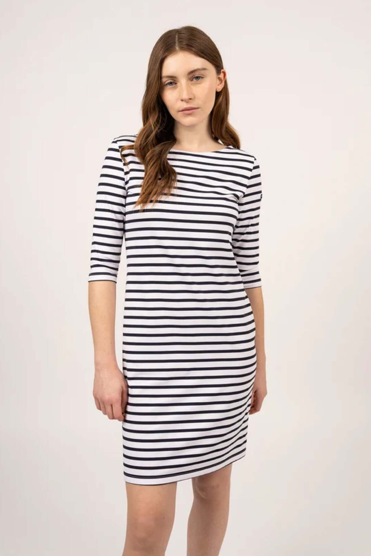 This short striped dress offers a sleek and feminine silhouette, ideal for everyday wear. Its straight cut hugs the body perfectly, while the stretch fabric ensures optimal comfort from morning to night. Easy to wear on its own or layered, it fits naturally into a versatile and timeless wardrobe.