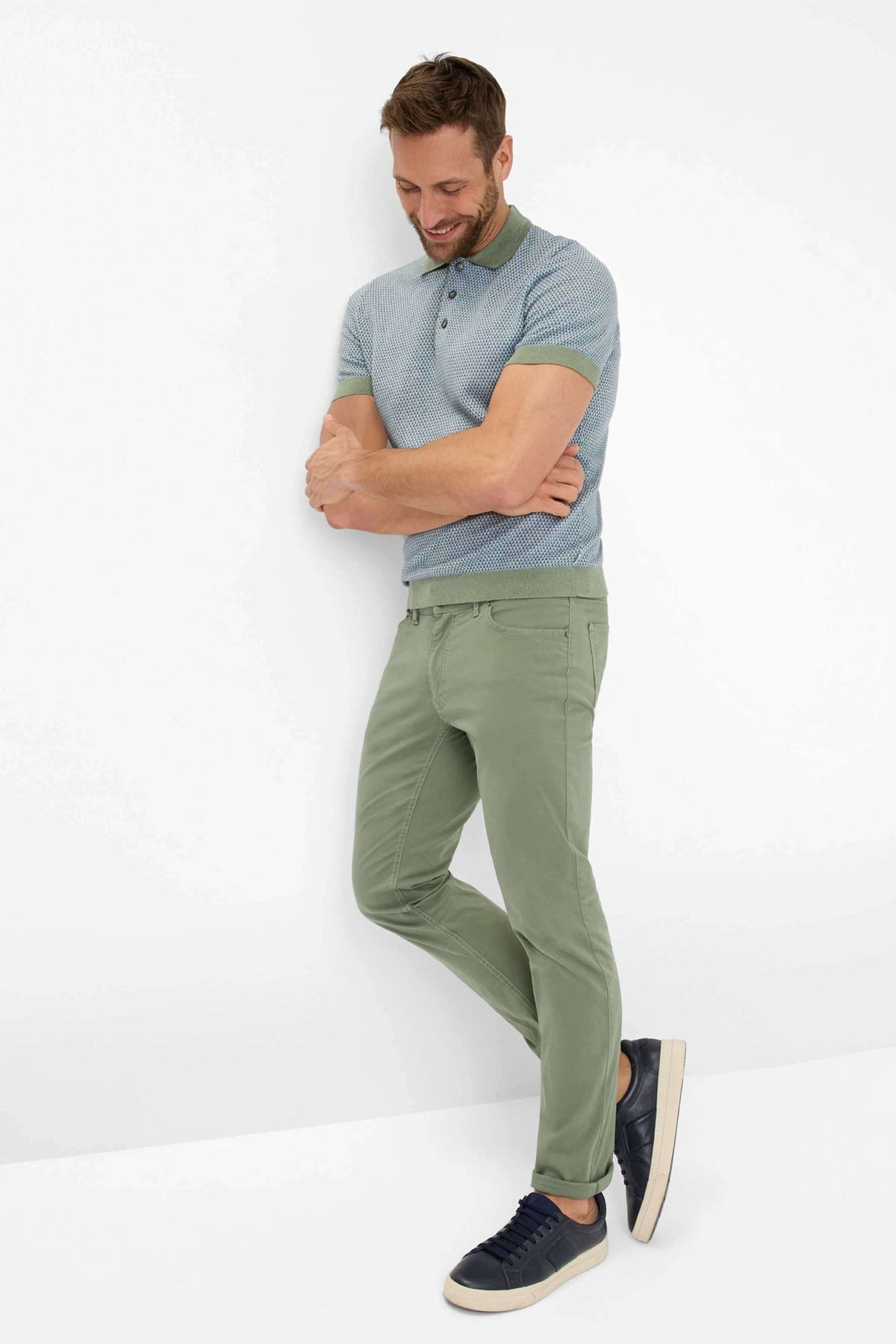 Homme élégant portant un polo bleu et un pantalon marathon vert, style moderne avec baskets confortables.