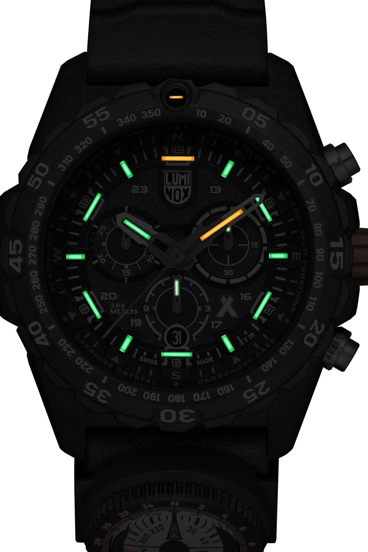 Le logo Luminox toujours présent aux côtés du propre logo de Bear à la position 4 heures remplace l'index de 12 heures. Tout en bas du cadran se trouve une fenêtre de date simpliste pour vous aider à rester sur la bonne voie au quotidien. Le cadran présente un affichage 12 et 24 heures pour répondre aux besoins des deux parties et vous permet de communiquer avec vos collègues compratiats. Au-dessus de l'anneau de chapitre se trouve la séquence de code morse pour SOS, sauvez nos âmes. Cela peut être vu à la position 11 heures en cas de besoin urgent. La palette de couleurs noir et orange revient à la couleur de Luminox et Bear Grylls, Luminox étant bien connu pour ses modèles noirs et le logo de Bear étant orange.