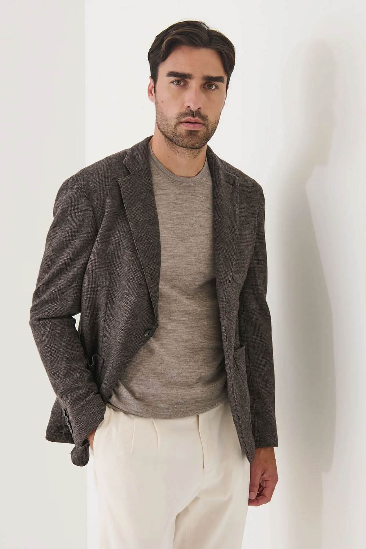 Description: Ce veston déstructuré en maille incarne l’élégance moderne avec une touche de décontraction. Confectionné en Italie dans une laine vierge légère, il arbore un motif prince-de-galles discret qui lui confère une allure sophistiquée sans excès de formalisme. Une pièce polyvalente qui s’adapte aussi bien aux tenues décontractées qu’aux ensembles habillés.