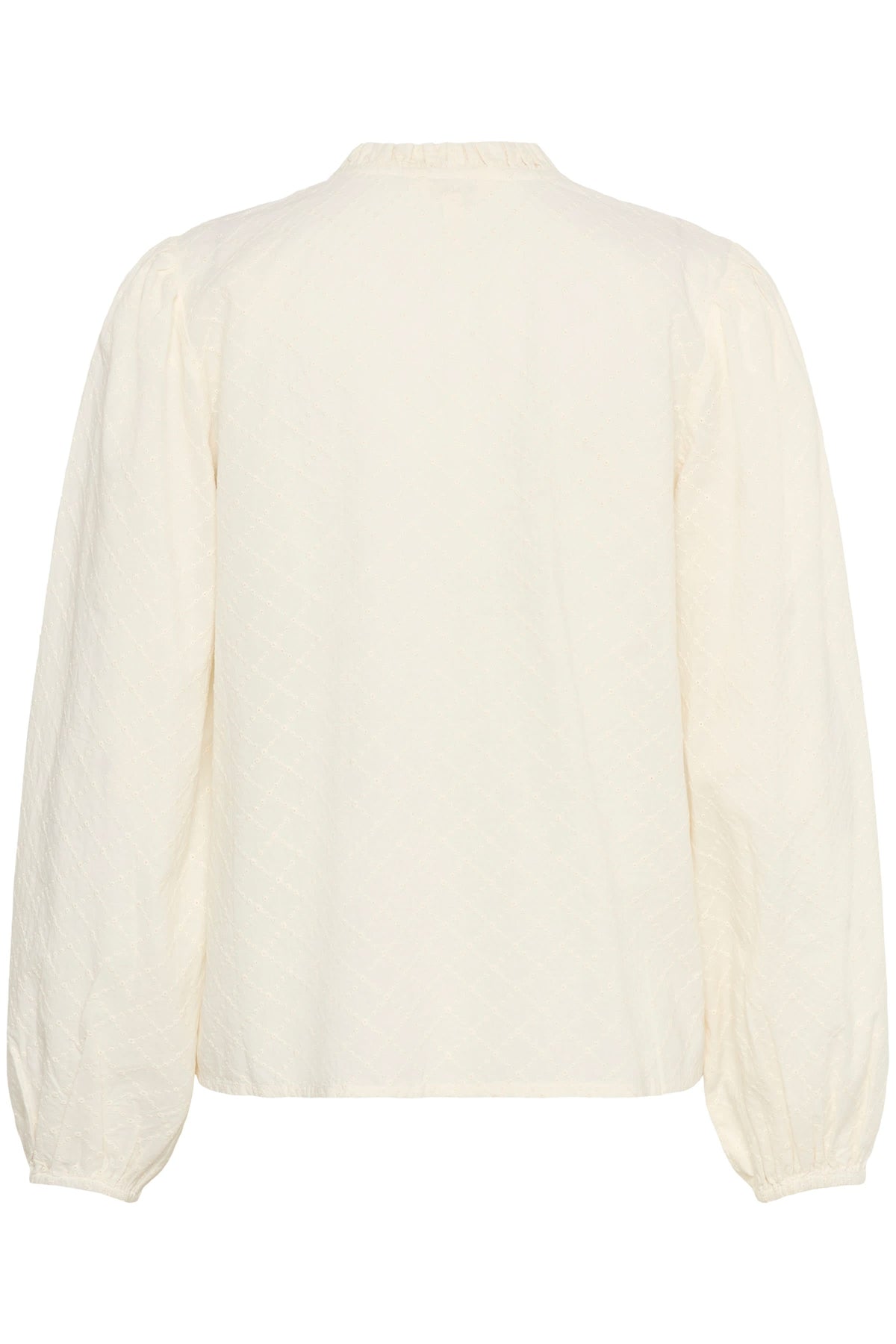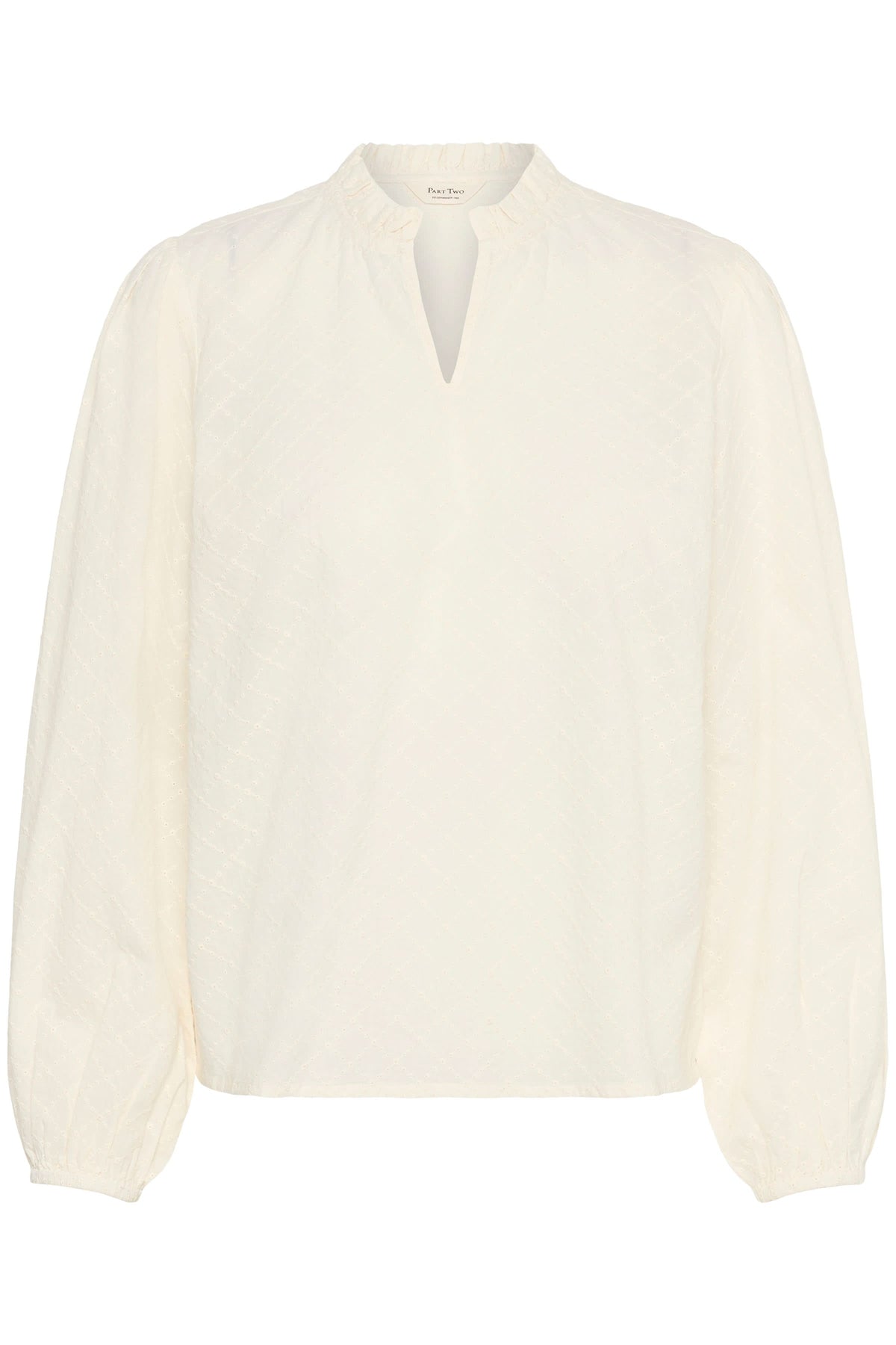 Description: Cette blouse légère séduit par son tissu délicat au motif discret et sa coupe fluide. Son encolure fendue subtile et ses manches longues bouffantes lui confèrent une allure féminine et raffinée. Conseil style : portez-la rentrée dans un pantalon habillé ou une jupe pour un look chic et élégant.
