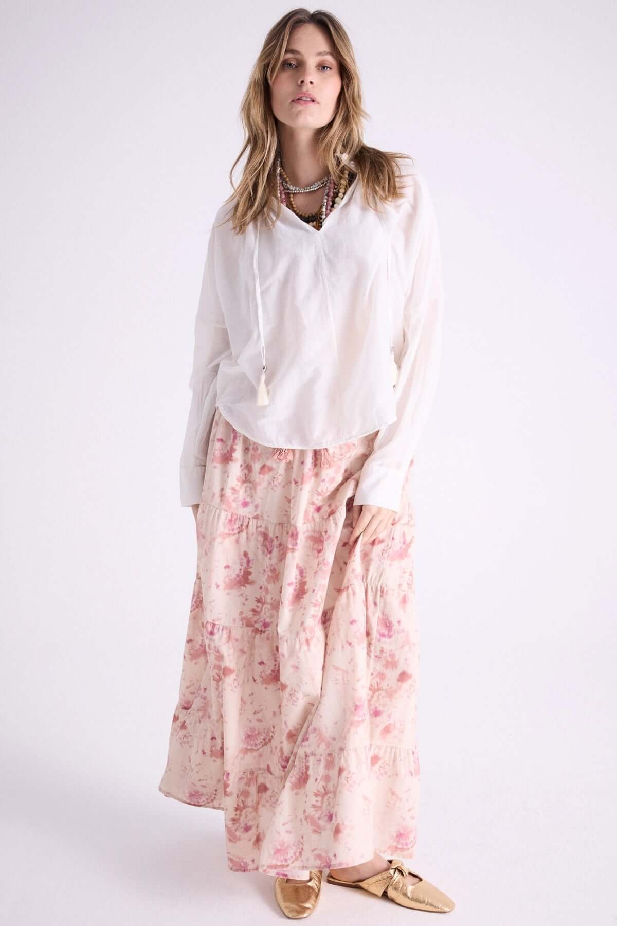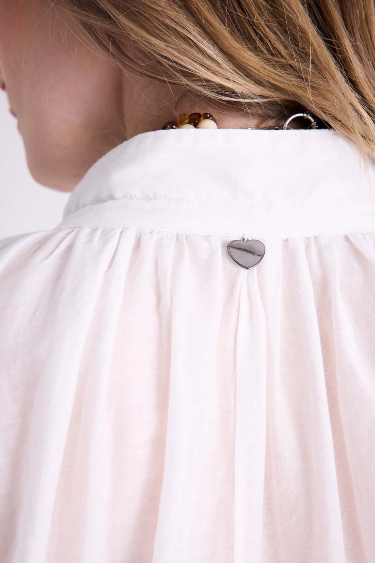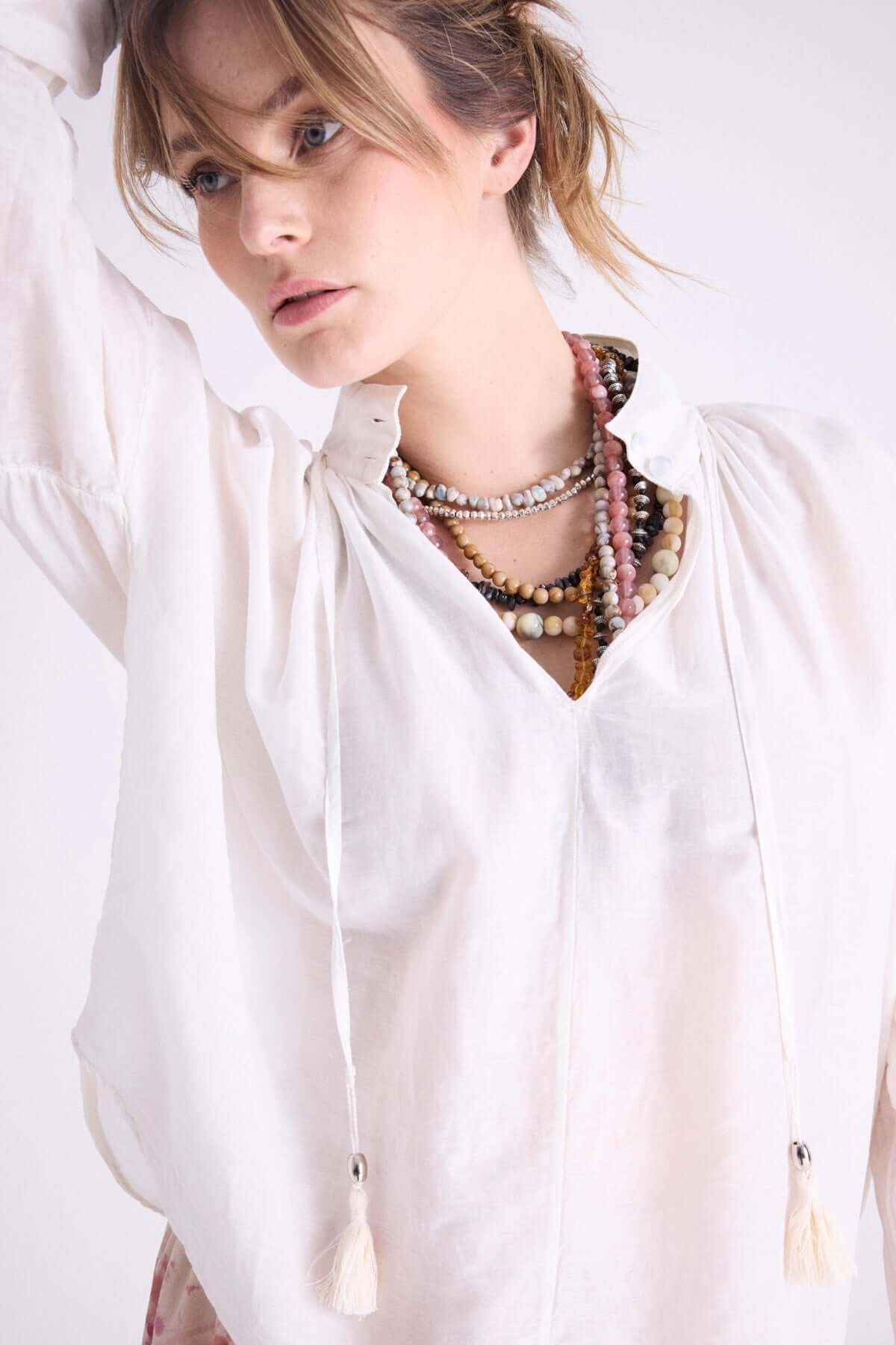 Description : Cette blouse légère à capuche dégage un esprit bohème tout en douceur. Son tissu vaporeux et ses cordons à pompons apportent une touche décontractée, parfaite pour les journées estivales. Idéale à superposer sur un débardeur ou une robe légère.