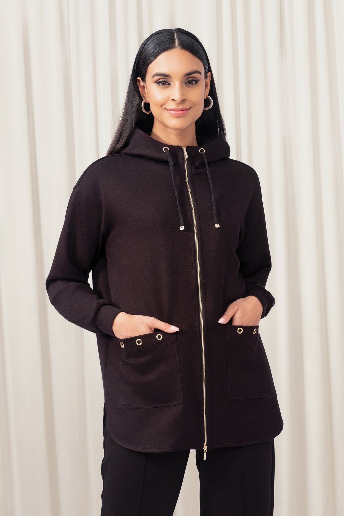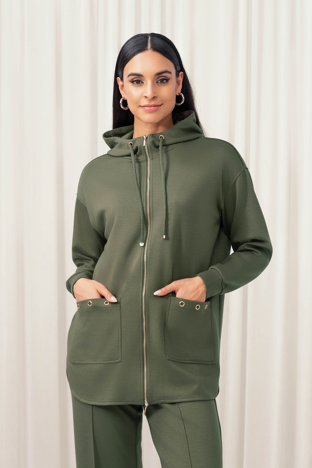 Description : Ce cardigan à capuche combine fonctionnalité et style avec sa fermeture zippée dorée et ses détails métalliques aux poches. Confortable et polyvalent, il s’adapte aussi bien aux looks décontractés qu’aux tenues plus structurées. Conseil style : portez-le avec un pantalon noir ajusté pour une silhouette sportive et urbaine.