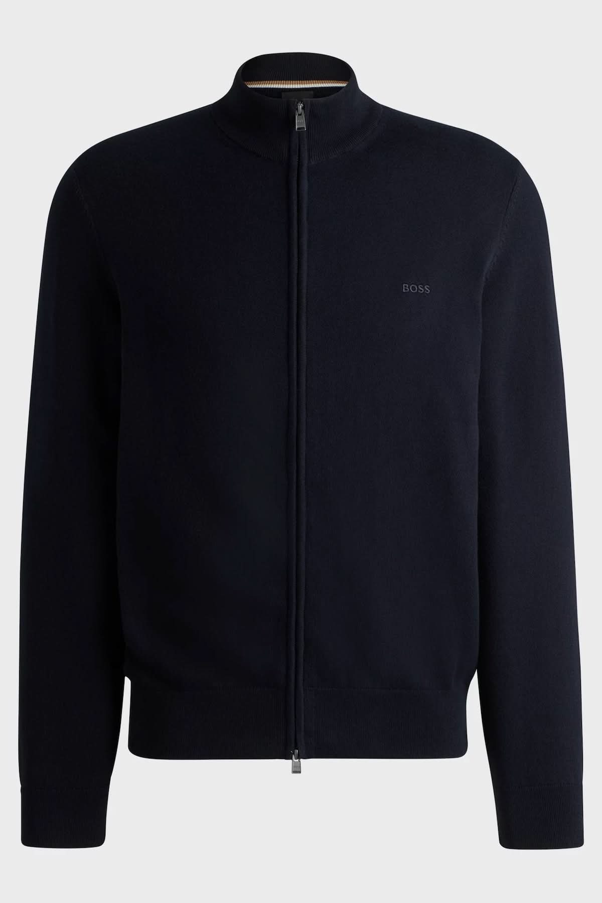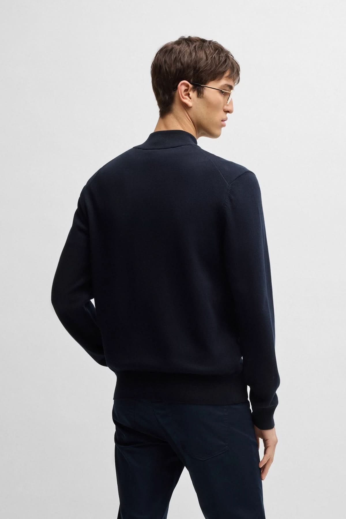 Description : Ce cardigan tricoté en coton se distingue par sa texture douce et son design minimaliste. Doté d’un col montant et de finitions côtelées, il offre une silhouette soignée et polyvalente — parfait pour rehausser un jeans ou un pantalon habillé.
