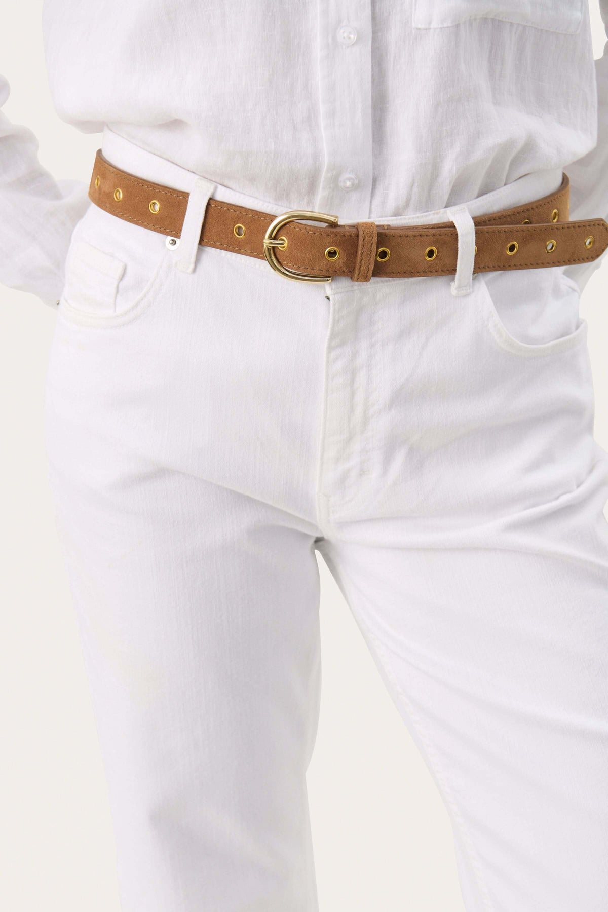 Ceinture Najad en suède avec œillets dorés, portée avec un jean blanc et chemise blanche.