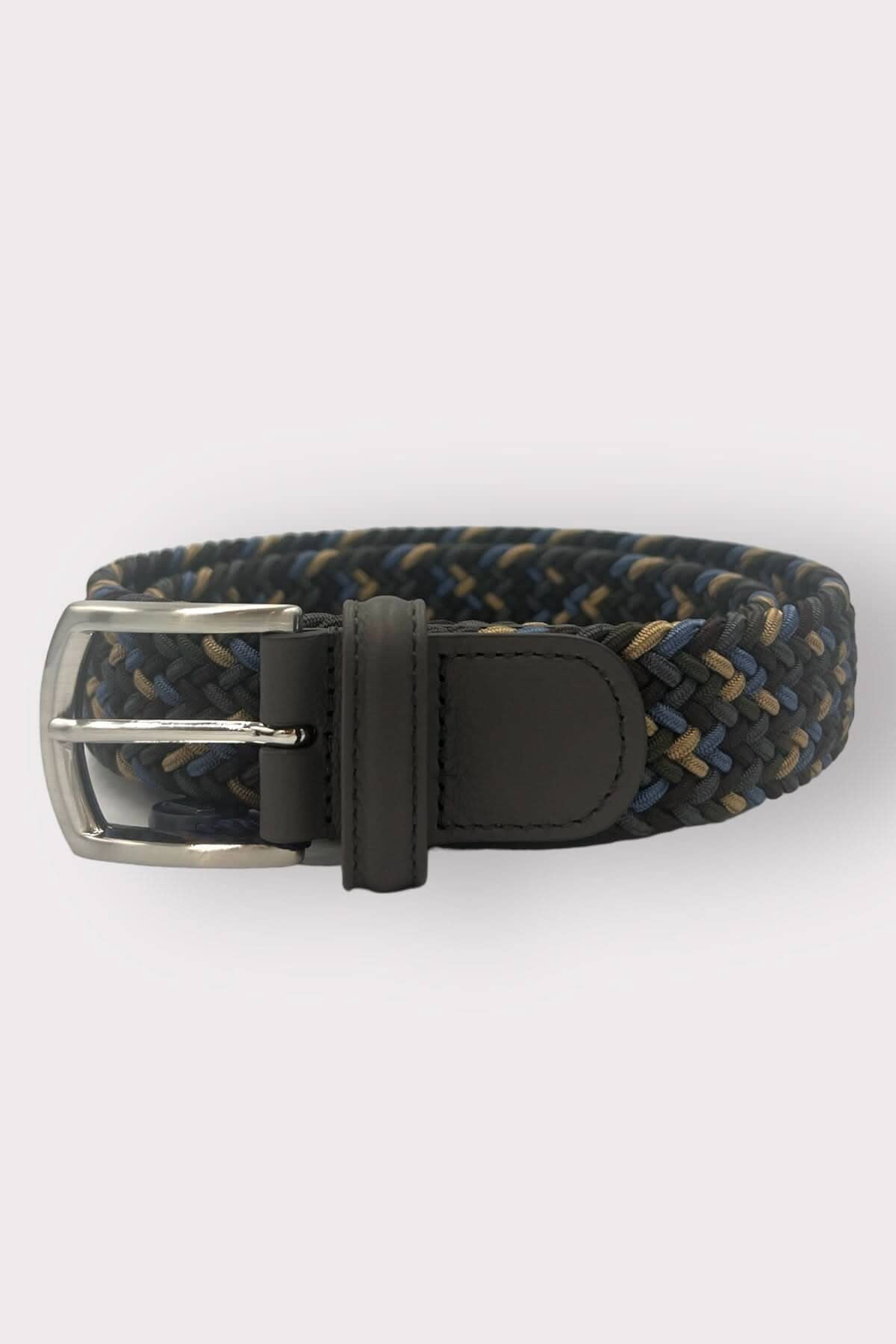 Ceinture tressée en tissu extensible avec des nuances de bleu et beige, idéale pour un look décontracté.