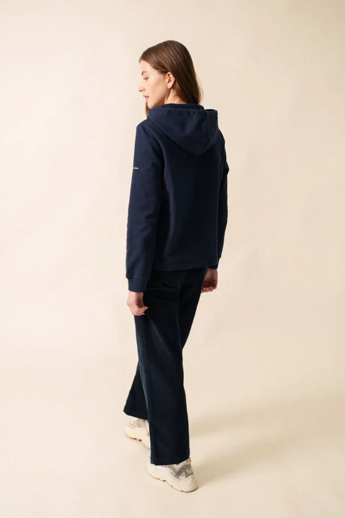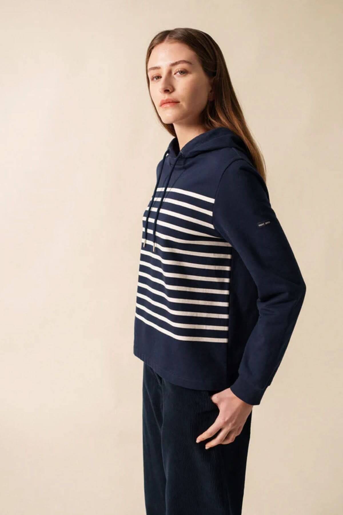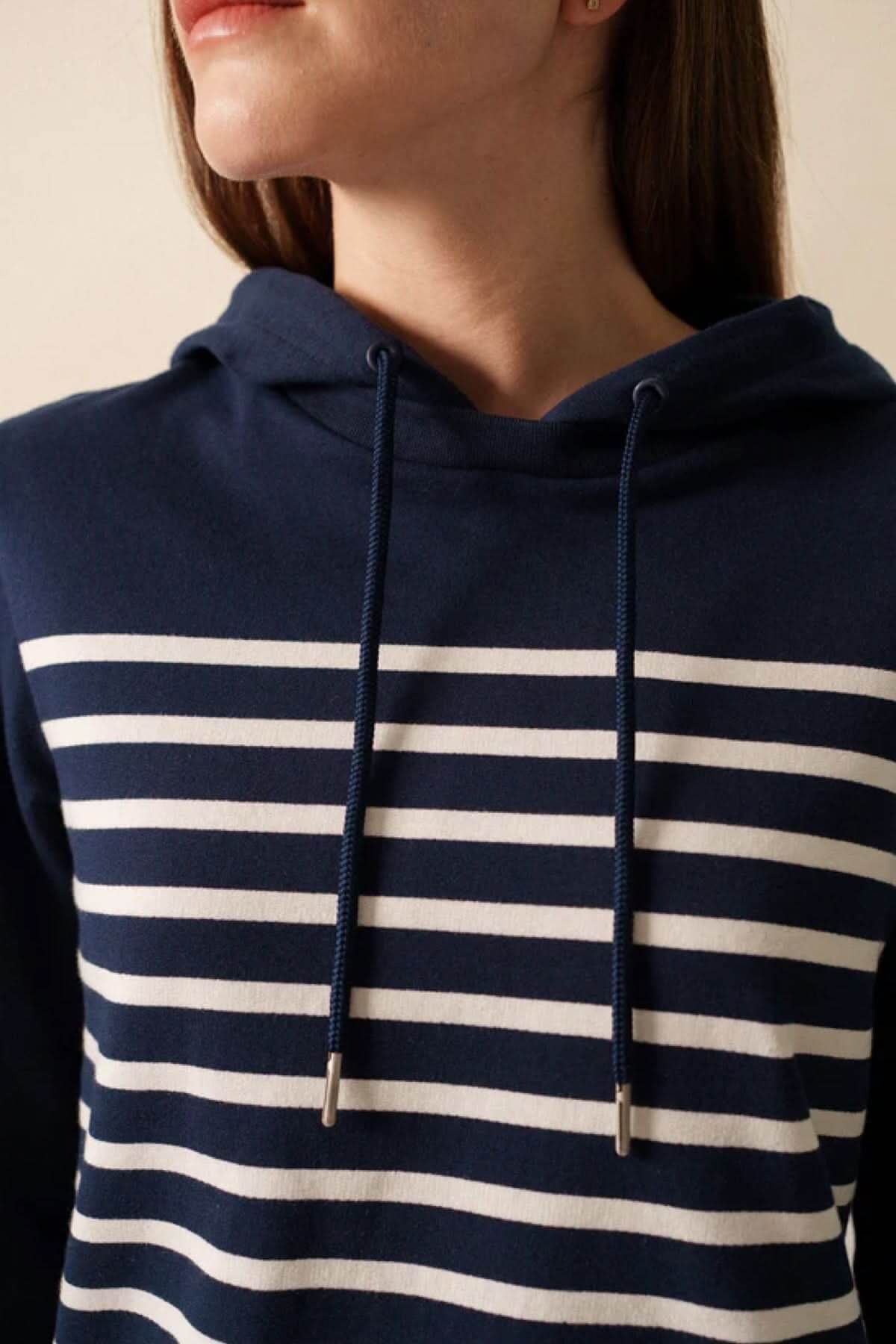 Description: Ce chandail à capuchon à manches longues arbore un style marin revisité avec ses rayures horizontales contrastées sur la poitrine et les manches. Sa coupe droite et son tissu doux offrent confort et modernité, parfait pour un look décontracté. Conseil style : portez-le avec un pantalon en velours côtelé ou un jean pour un esprit casual chic.