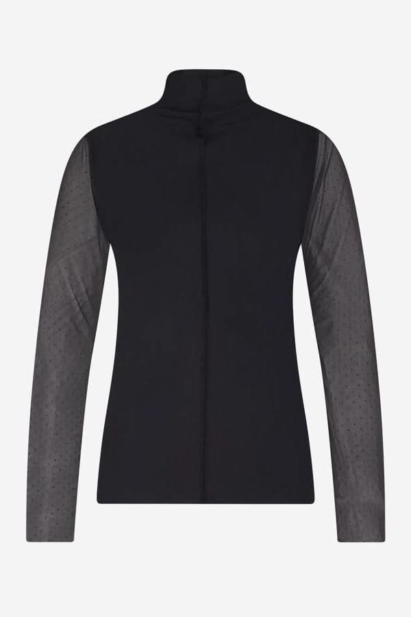 Description : Ce chandail à col montant allie minimalisme et élégance moderne. Sa coupe ajustée met en valeur la silhouette, tandis que ses manches transparentes ajoutent une touche de légèreté et de sophistication. Idéal pour les tenues de soirée ou les looks professionnels chics.