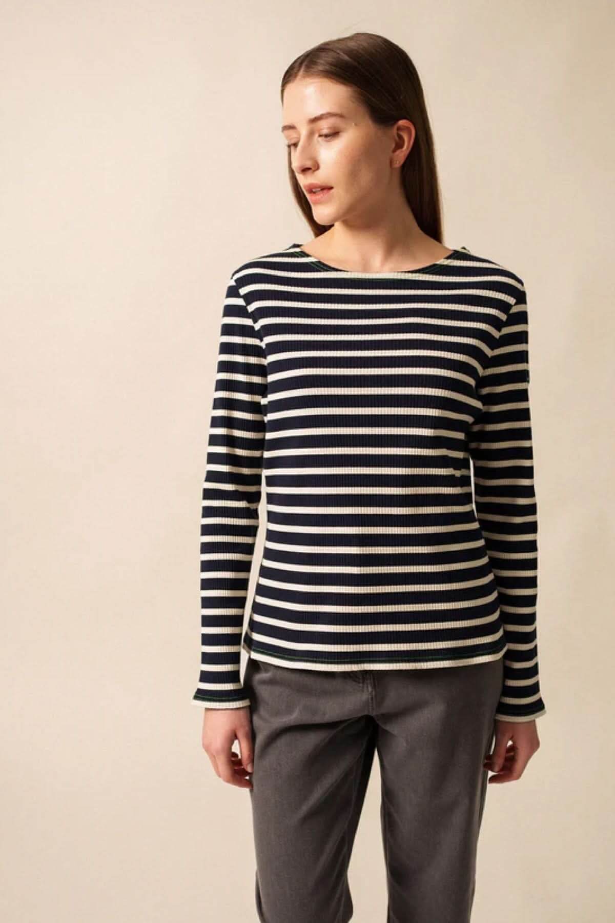 Description: Chandail à manches longues orné de rayures intemporelles, conçu dans une maille côtelée confortable. Avec son encolure ronde et sa coupe ajustée, il se porte aussi bien seul que sous une veste pour un style décontracté et raffiné.