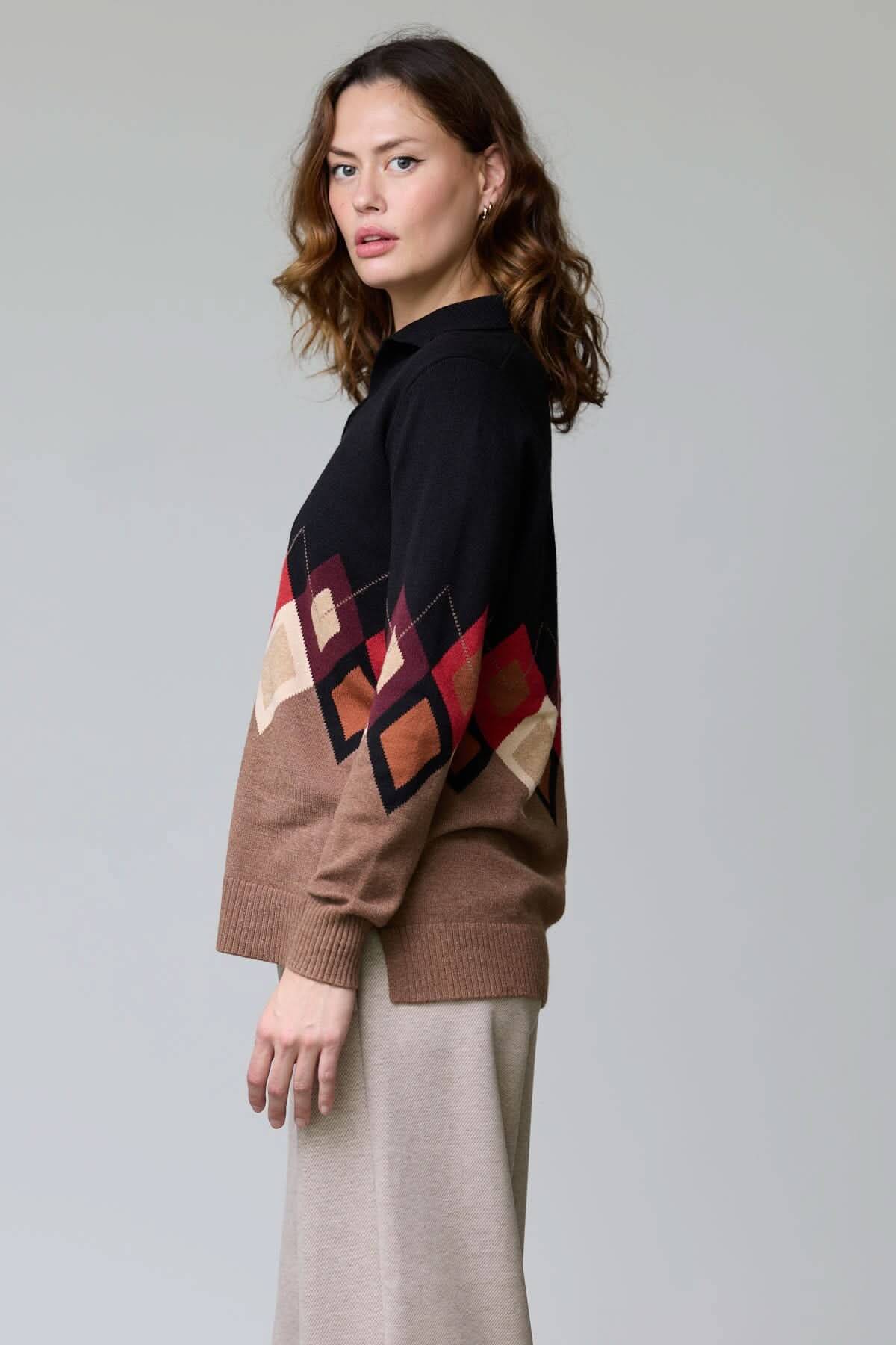 Description : Ce chandail à col ouvert se distingue par son motif losanges aux teintes chaleureuses et sa coupe décontractée. Sa maille douce et son col à revers en font une pièce élégante et confortable, parfaite pour la saison fraîche.
