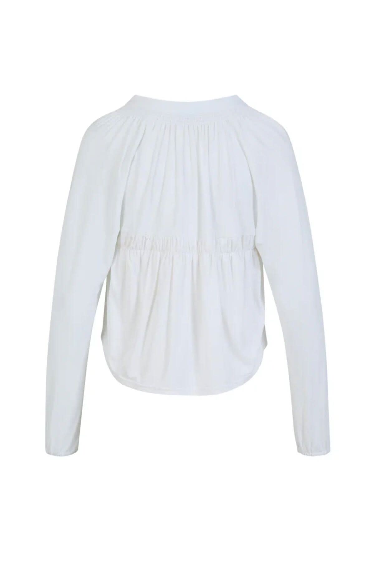 DESCRIPTION : Ce chandail blanc apporte une touche subtile dans sa couleur blanche. Les détails smockés au dos soulignent élégamment votre silhouette, donnant une expression sophistiquée et flatteuse à votre look.