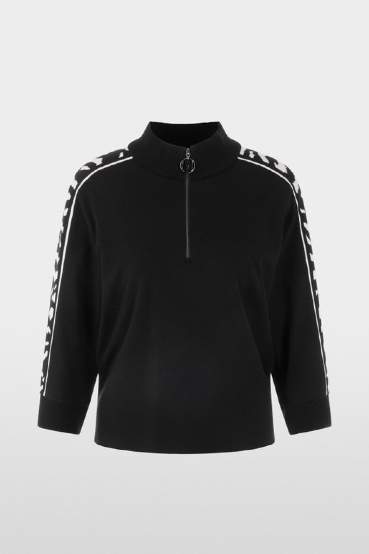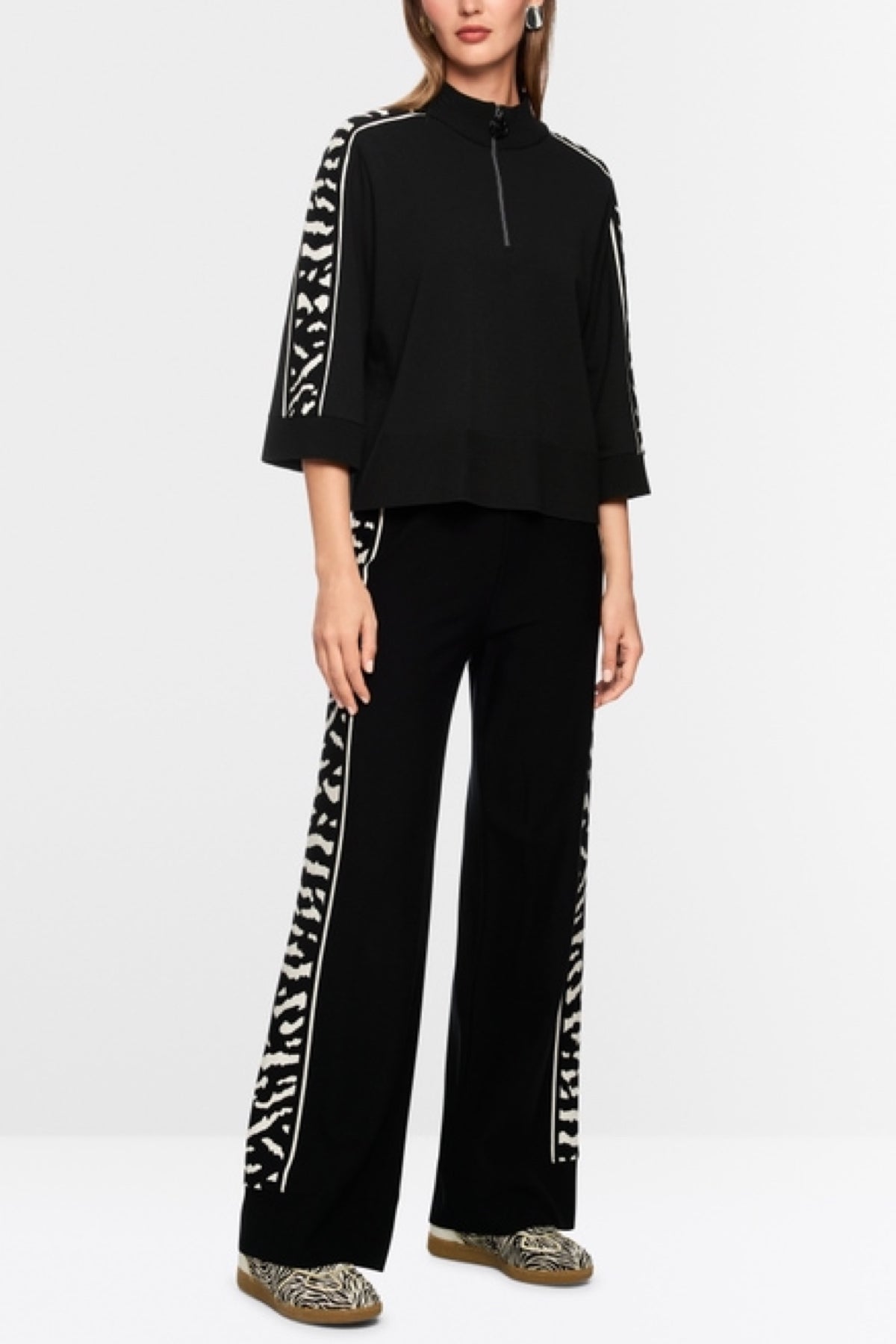 Description : Ce chandail séduit par sa coupe ample et ses larges manches 3/4 avec une large bande contrastée au motif animalier qui orne la manche. Le col et l'ourlet sont dotés de larges bords-côtes. Une fermeture à glissière à l'avant du col permet de porter le chandail ouvert. Ce modèle est fabriqué de manière responsable et porte le label de durabilité « Rethink Together ».