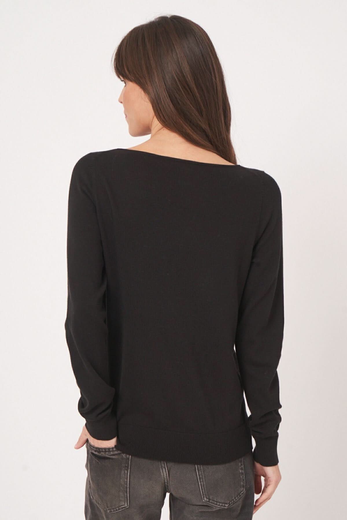 Chandail basique noir à encolure bateau, coupe droite élégante et confortable, vue arrière.