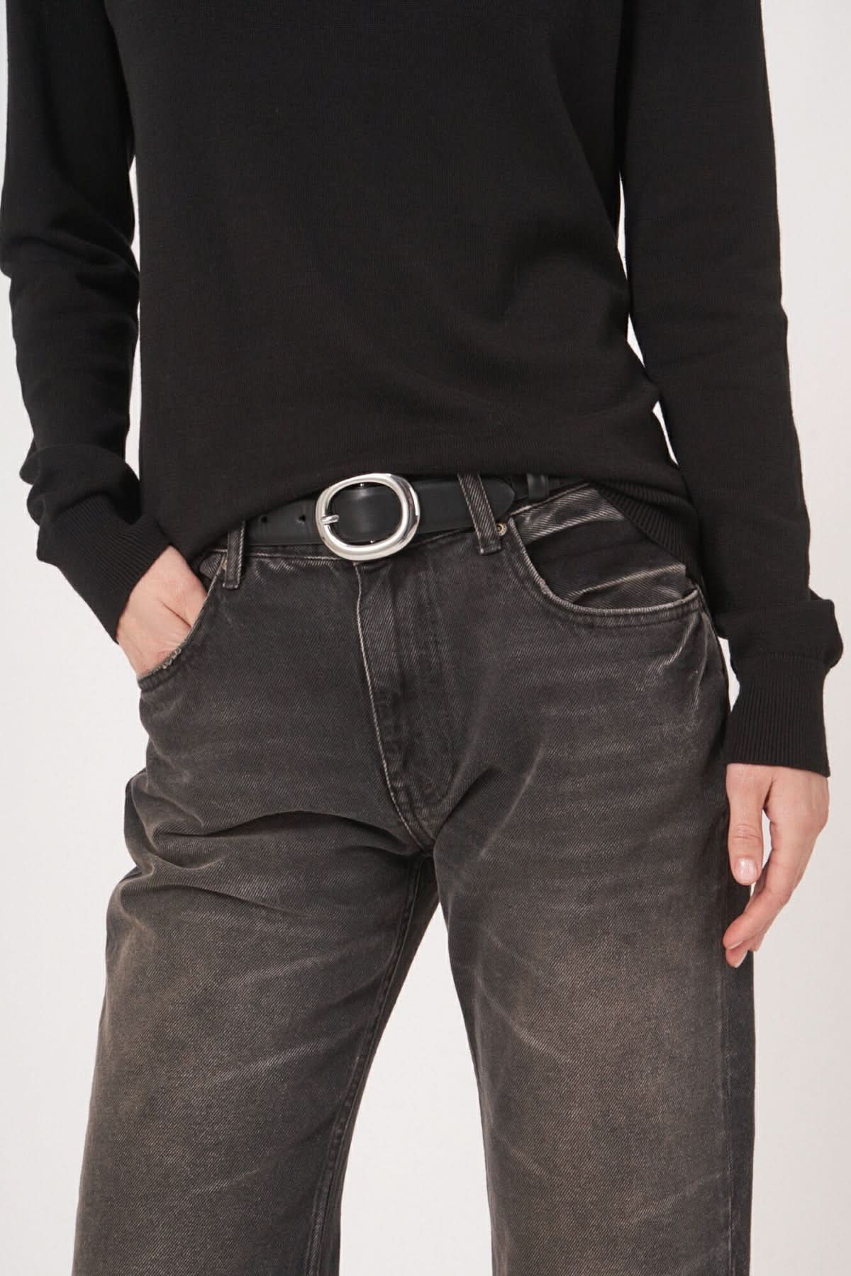 Chandail basique noir à encolure bateau avec ceinture en métal et jean délavé pour un look minimaliste.
