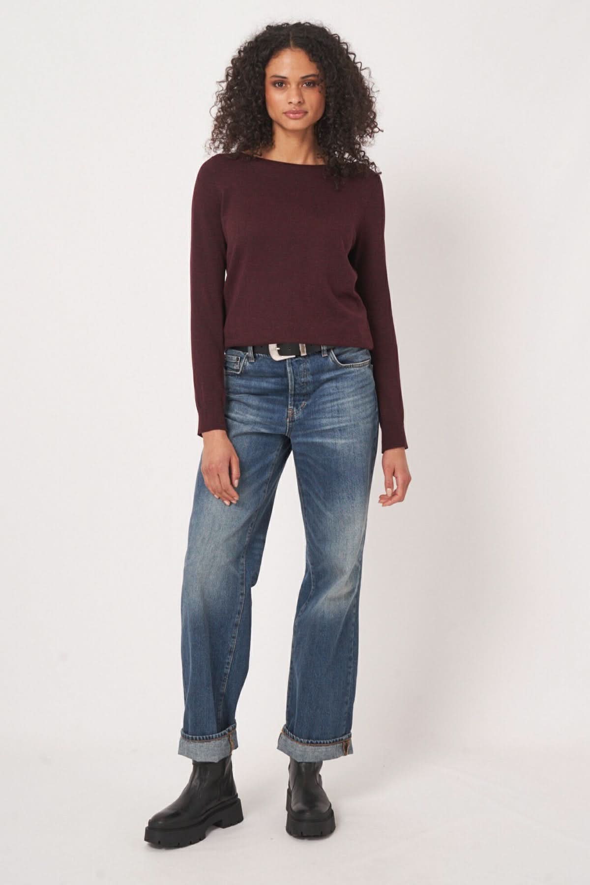 Chandail basique à encolure bateau en bordeaux, porté avec un jean bleu délavé pour un look décontracté.