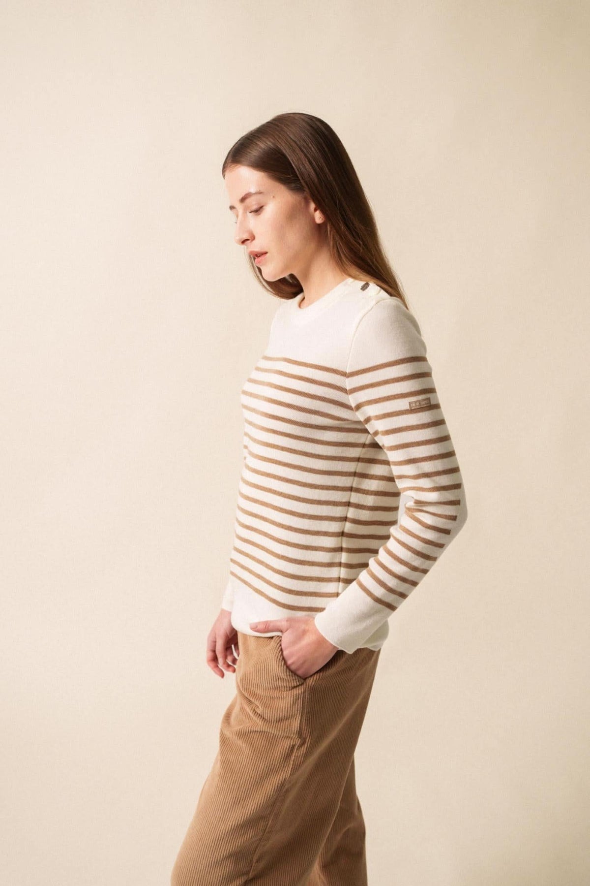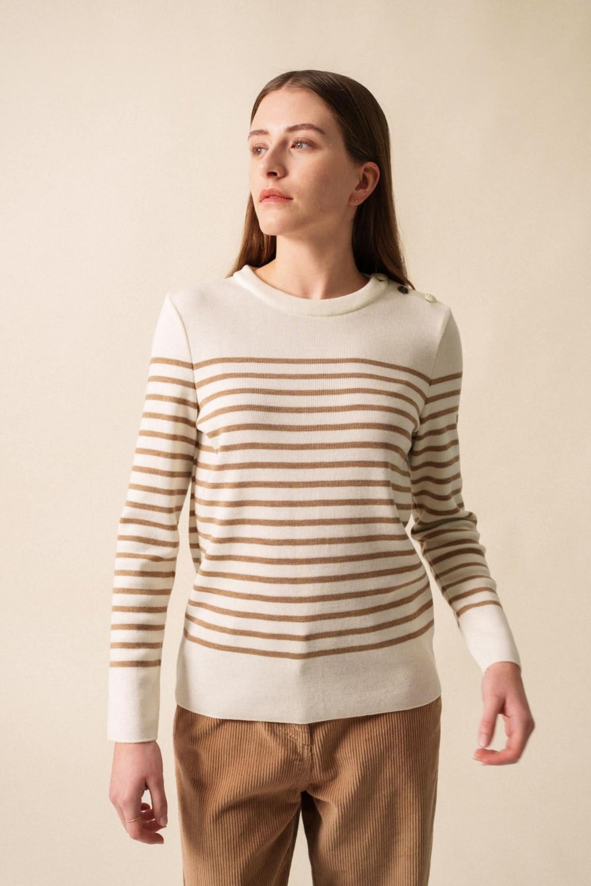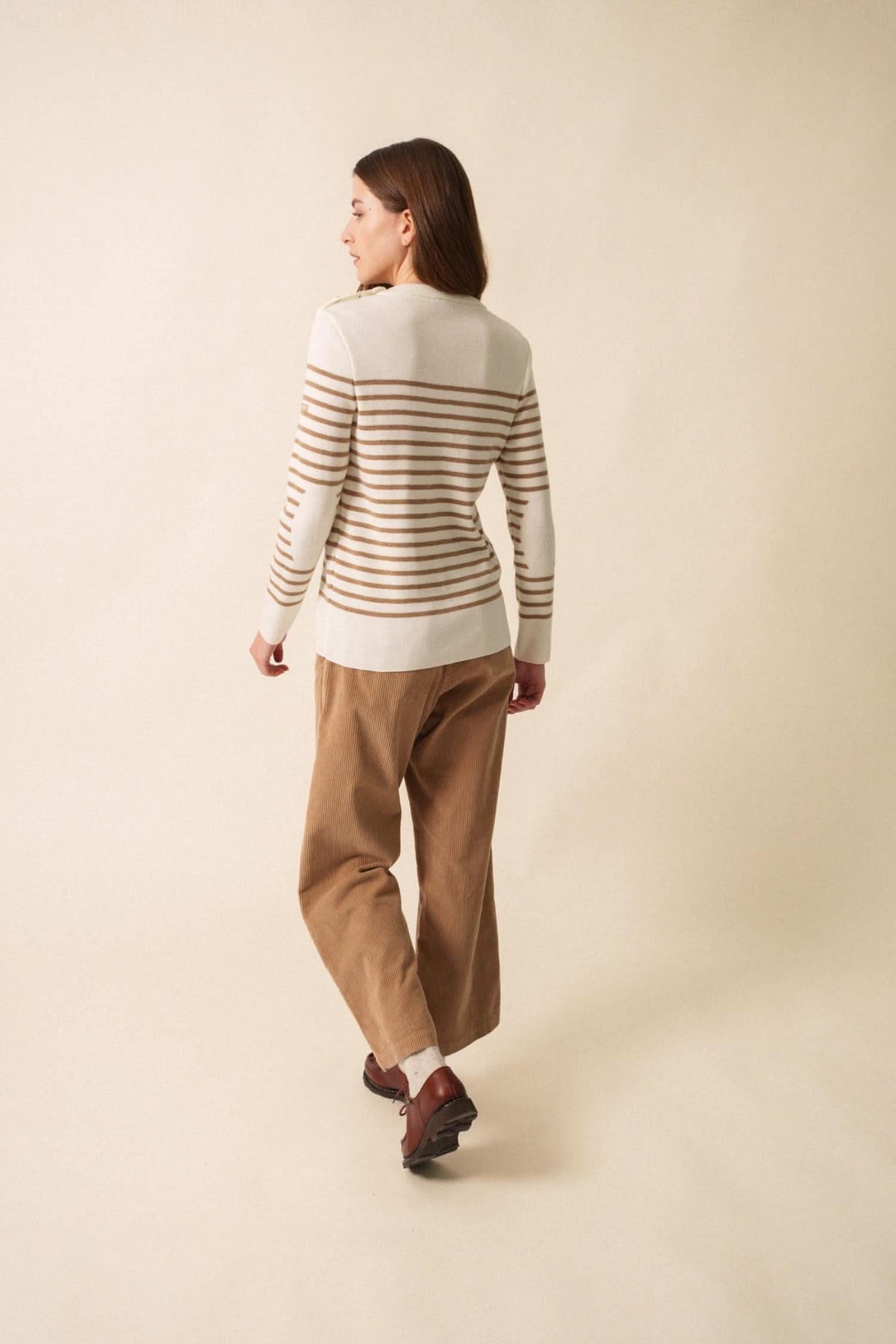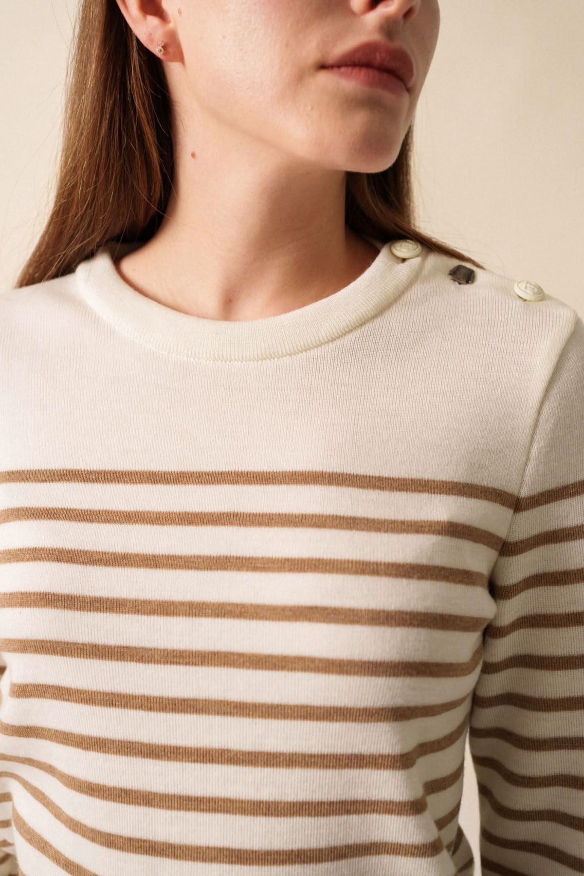 Description: Ce chandail marinière réinterprète un classique avec élégance. Tricoté en jersey de laine douce, il arbore des rayures placées qui structurent le haut du corps. Les boutons sur l’épaule gauche ajoutent une touche d’inspiration marine discrète. Conseil style : associez-le à un pantalon en velours ou un denim droit pour une silhouette automnale décontractée.