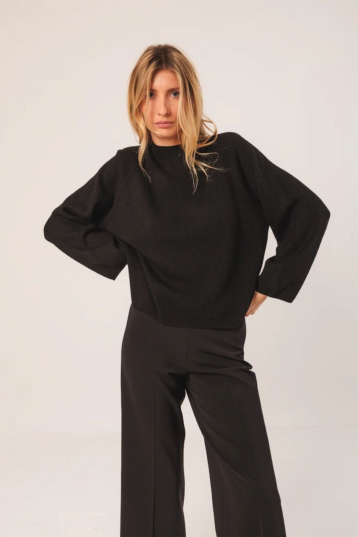 Description: Ce chandail en maille fine se distingue par sa coupe ample et son style minimaliste. Son col rond et ses manches longues légèrement larges en font une pièce polyvalente, idéale pour un look à la fois chic et décontracté. Conseil mode : portez-le avec un pantalon tailleur pour une allure élégante ou avec un jean pour un style plus casual.