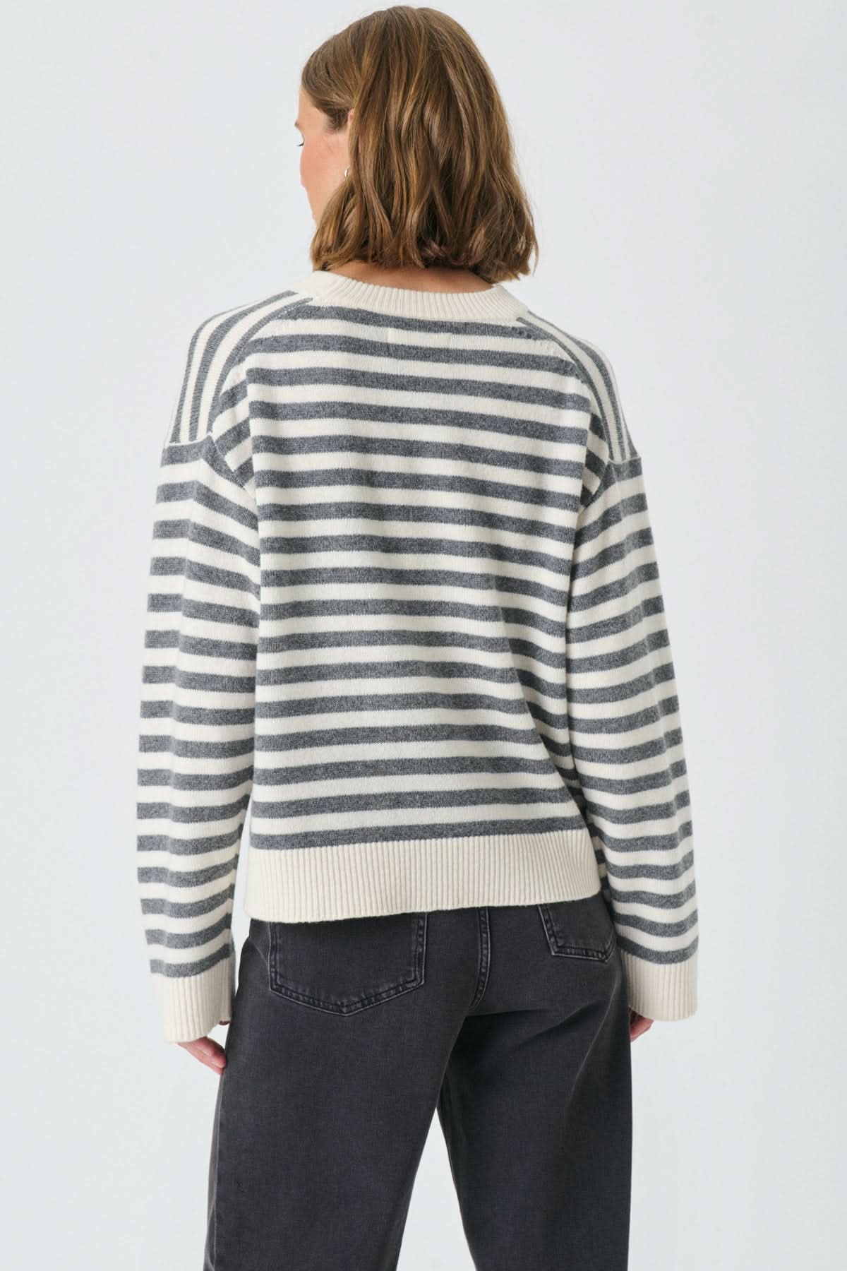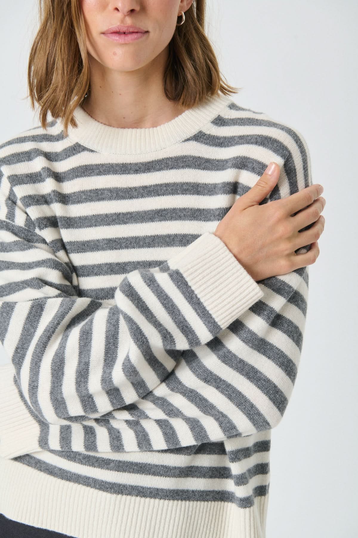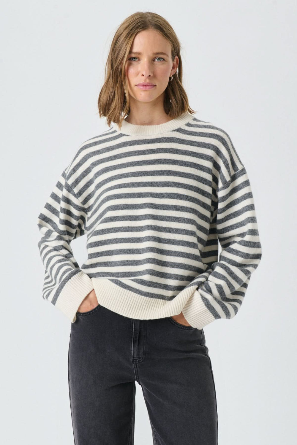 Description : Chandail à manches longues orné de rayures horizontales, confectionné dans une maille douce au tomber souple. Sa coupe légèrement ample et son col rond côtelé lui donnent une allure décontractée et contemporaine. Idéal pour une tenue de week-end avec un jeans ou un pantalon habillé pour un style marin revisité.
