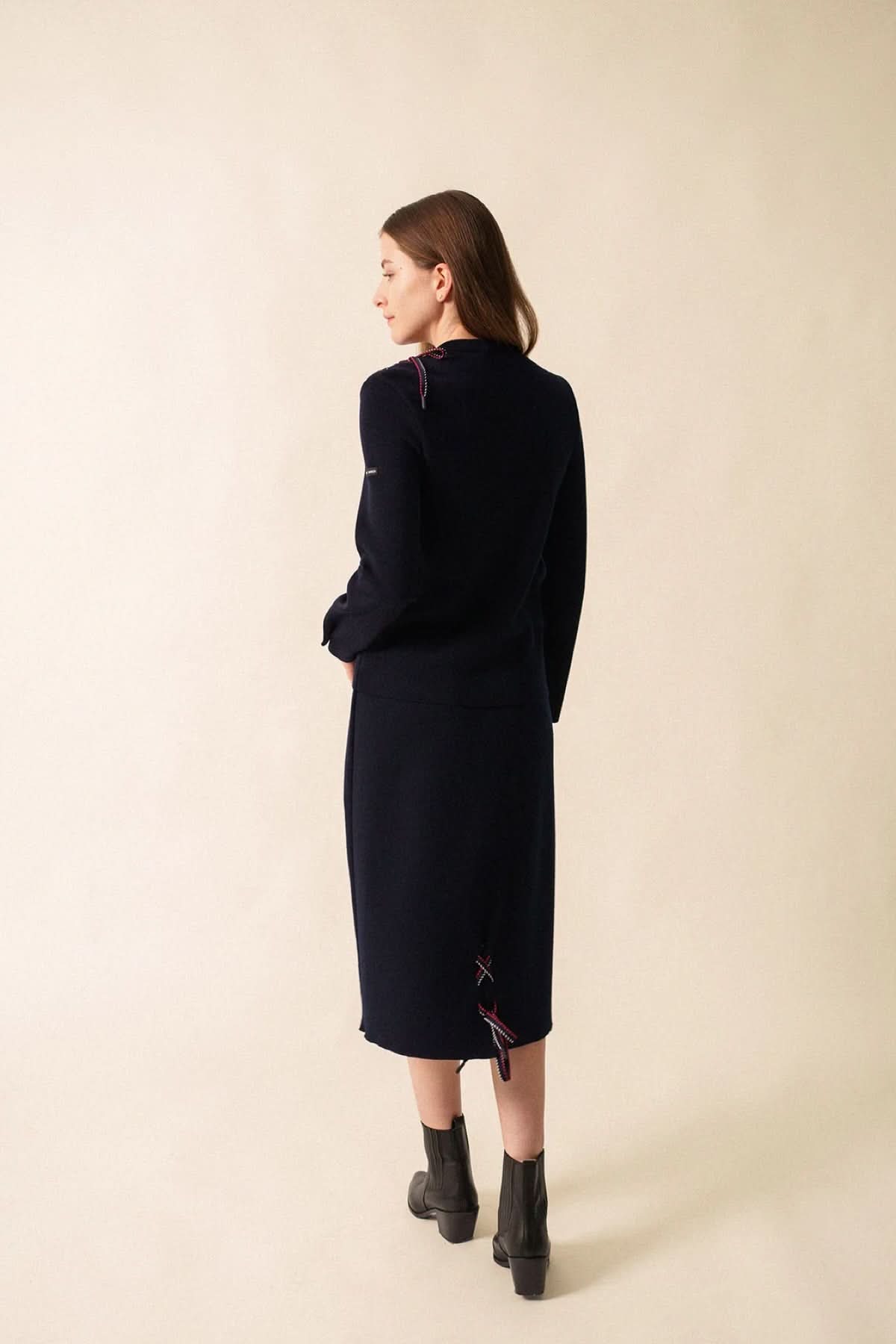 Description : Ce chandail en maille fine se distingue par son allure raffinée et féminine. Son design épuré est rehaussé d’un délicat nœud contrasté sur l’épaule, ajoutant une touche d’originalité subtile. Sa coupe droite et ses manches longues offrent une silhouette élégante et confortable, parfaite pour les journées fraîches. À porter avec une jupe ou un pantalon pour un look chic et intemporel.