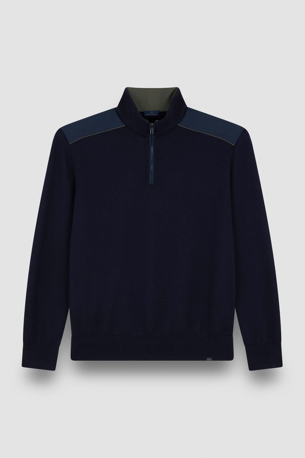 Description : Ce chandail à col montant zippé incarne une élégance moderne avec ses détails contrastants aux épaules et poignets. Son tricot texturé offre un confort chaleureux et une silhouette décontractée. Conseil style : portez-le sous un manteau matelassé avec un pantalon fuselé pour un look urbain structuré.