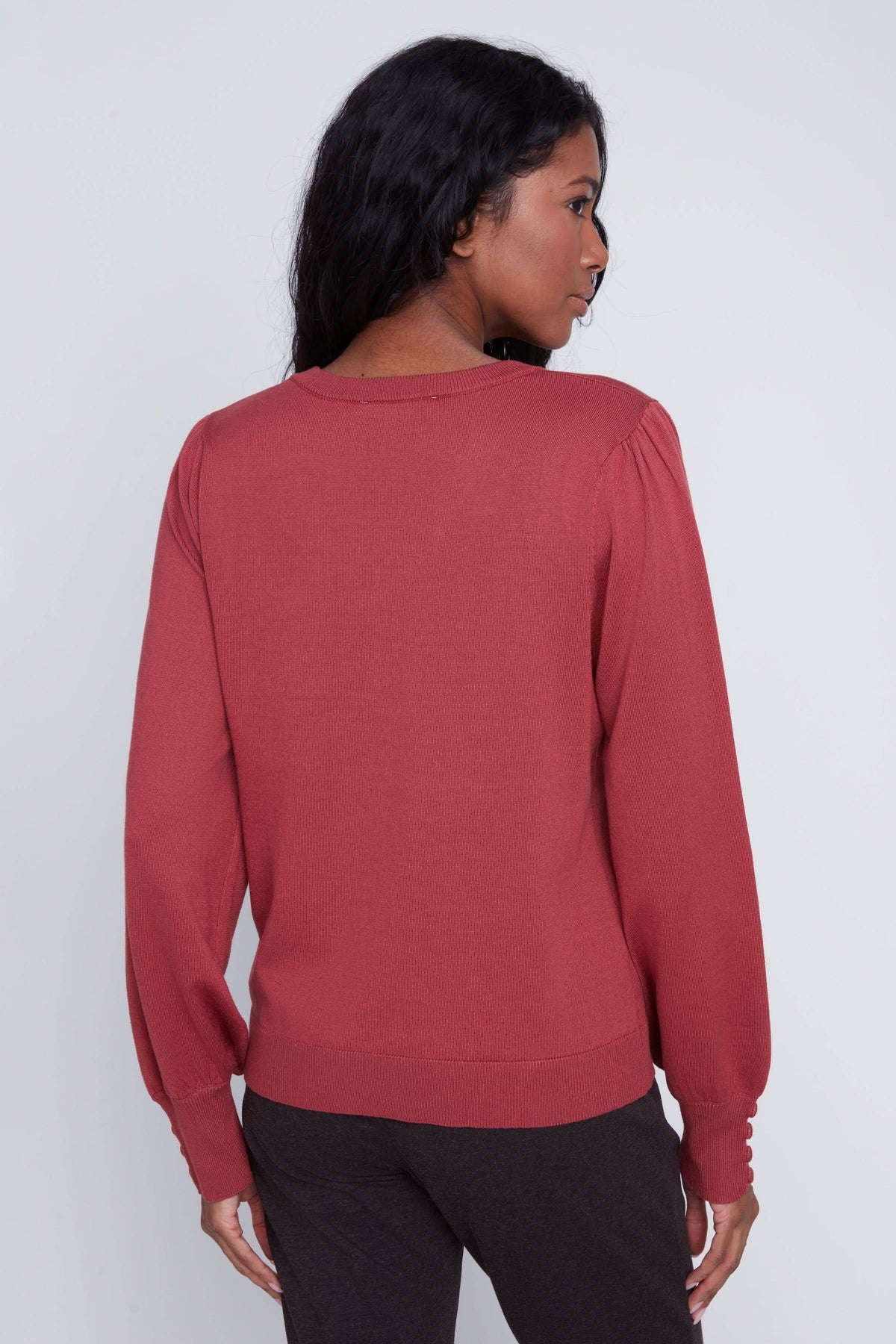 Description: Ce chandail à manches longues séduit par son encolure en V et ses manches légèrement bouffantes, terminées par des poignets boutonnés pour une touche élégante. Sa coupe droite et son tissu léger offrent confort et féminité, idéal pour un style chic au quotidien. Conseil style : portez-le avec un pantalon ajusté ou une jupe crayon pour mettre en valeur sa coupe fluide.